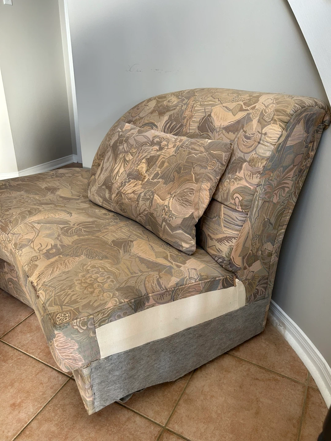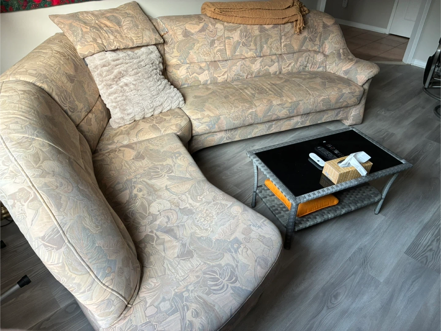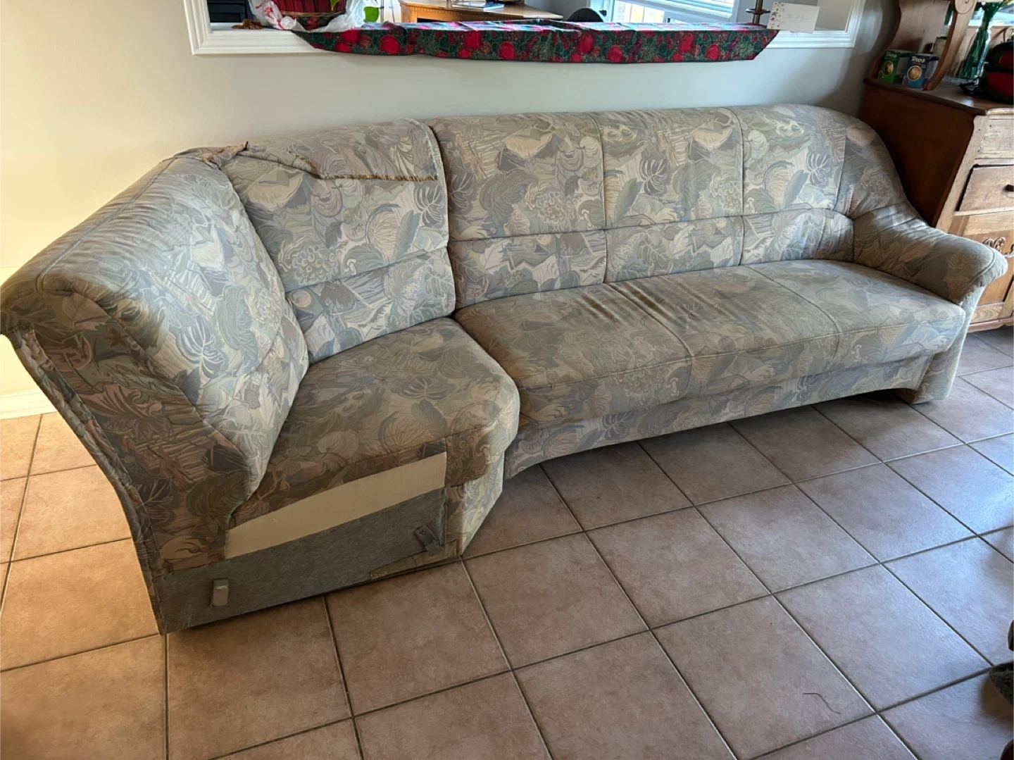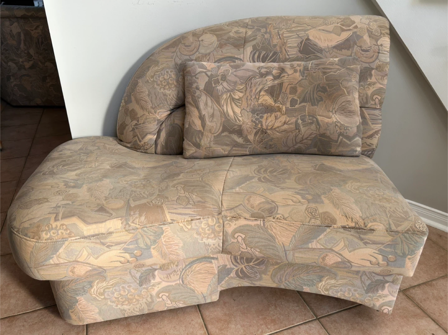 Selling a comfortable 3 piece sectional sofa with a unique floral pattern! Made in Germany, excellent quality. It features a curved design and comes with a matching pillow. Perfect for adding a touch of vintage charm to your living room or den.