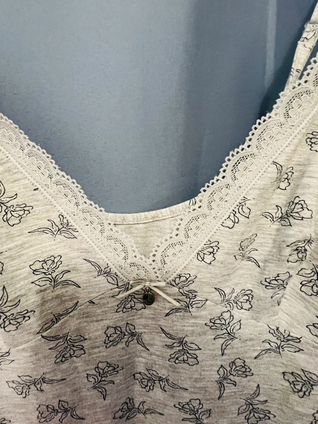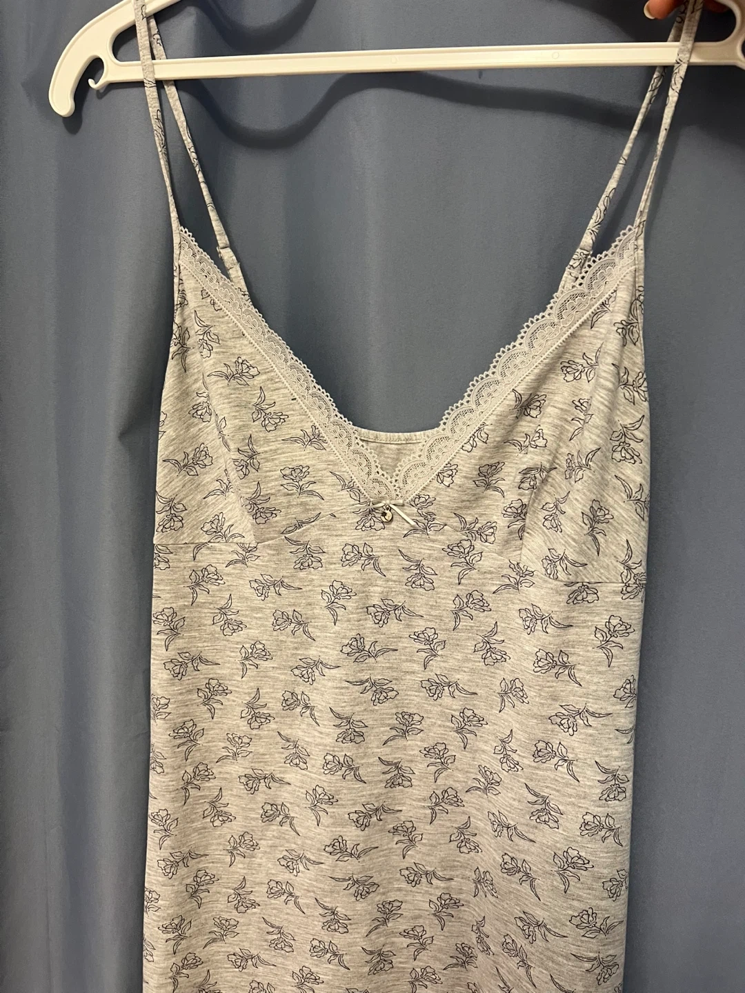 Want to trade a cute cami nighty with a grey floral print! Size XS - S It has a lace trim around the neckline. It's in great condition and wearing on a warm night. Super flexible, stretchy and comfortable fabric. I worn only once since unfortunately it didn’t fit me well :( Since I ordered it online from a different country, the return or exchanging the product was a real hassle.