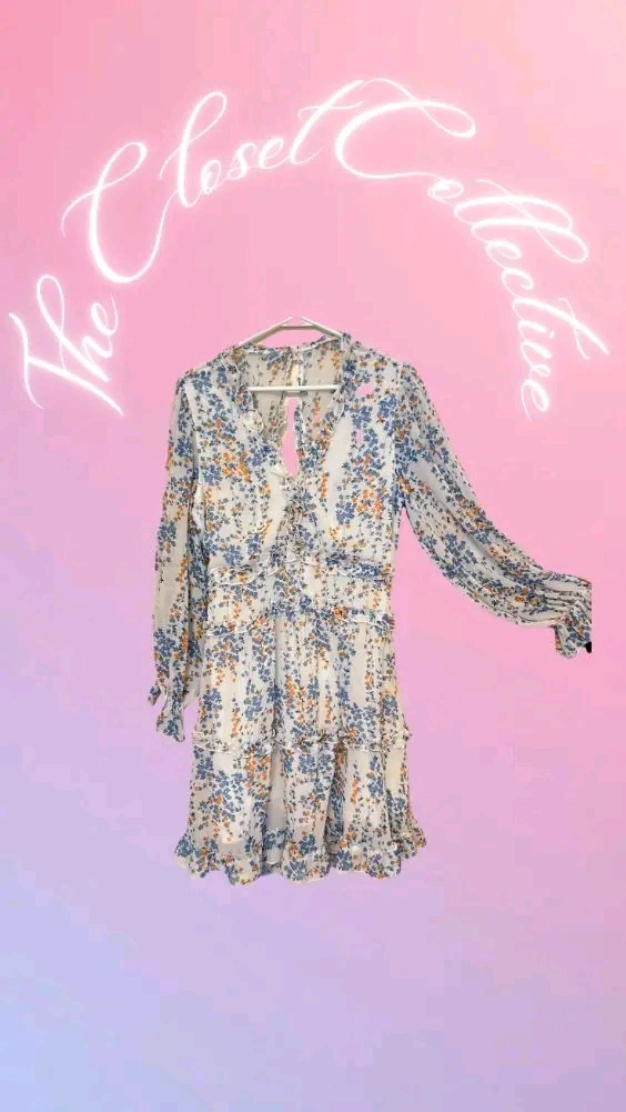 Here's a cute floral print mini dress! It features long sleeves, a v-neck, and a tiered skirt. Perfect for a sunny day out or a casual event