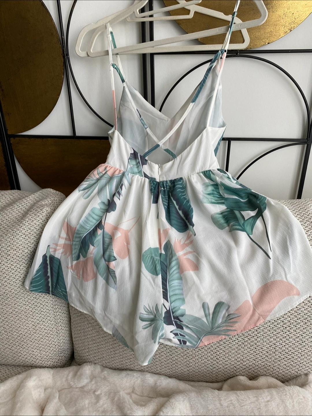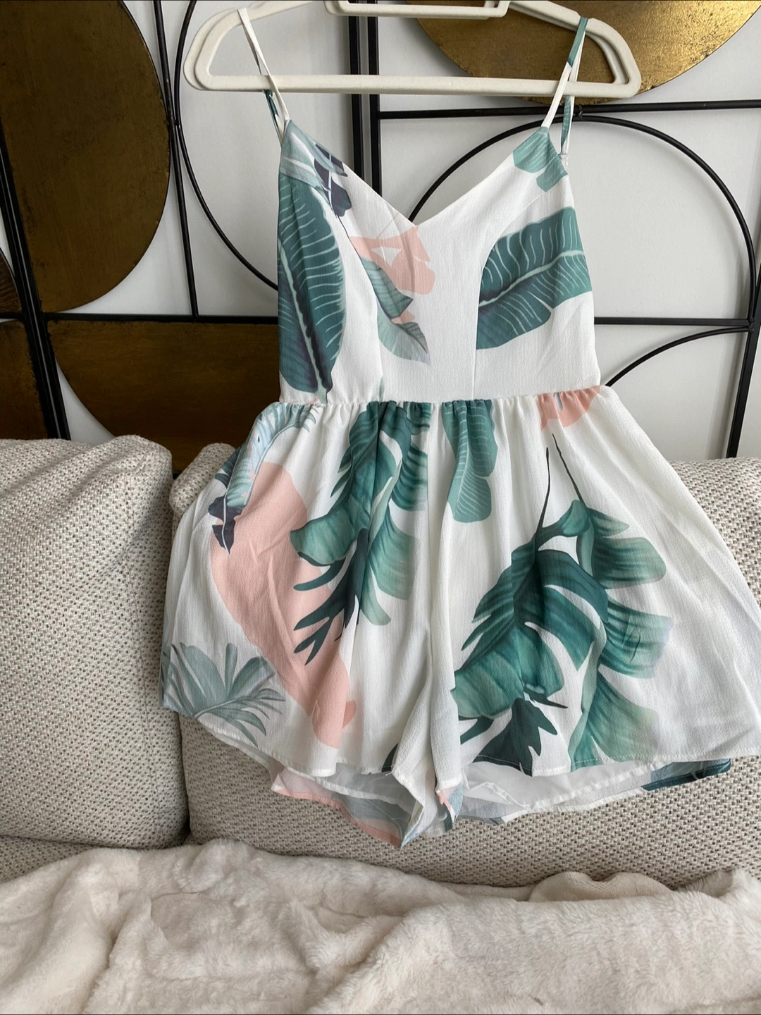 Super cute floral romper in size XS! It's made of 100% polyester and features a lovely leaf pattern. Perfect for a sunny day out or a casual get-together. Boutique find.