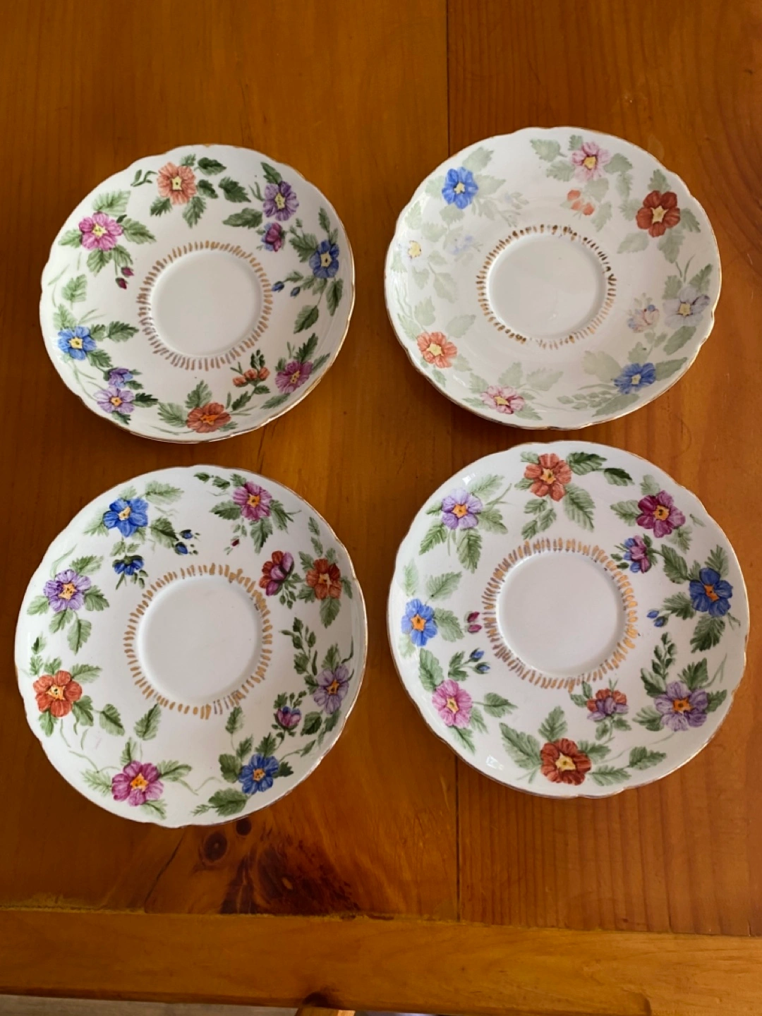 Selling a set of 4 “Shelley” saucers with a lovely floral pattern. They're in great shape and would be perfect for adding a touch of charm to your tea set!
