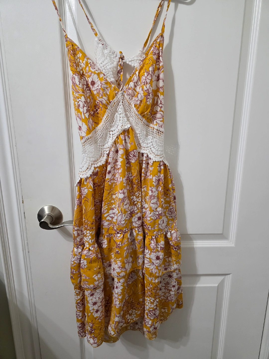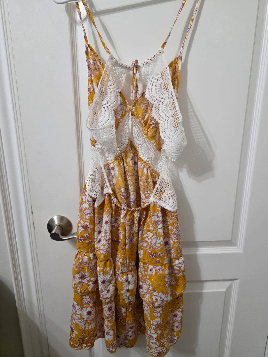 A cute floral halter beautiful beachdress, perfect for summer days! It features a yellow and white floral pattern and a lace back detail. The dress is in great condition and ready for a new home
