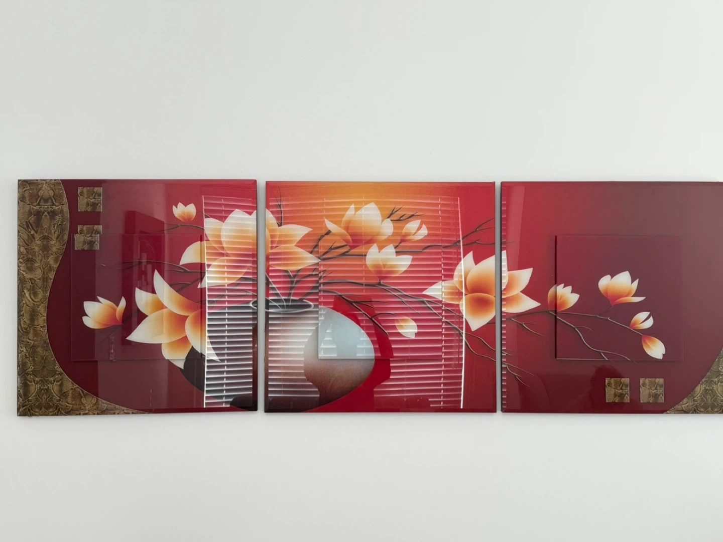 Selling a beautiful triptych wall art piece. The artwork features a floral design in shades of burgundy, gold, and white. It would add a touch of elegance to any room Please contact email Shaheen.saeed@gmail.com