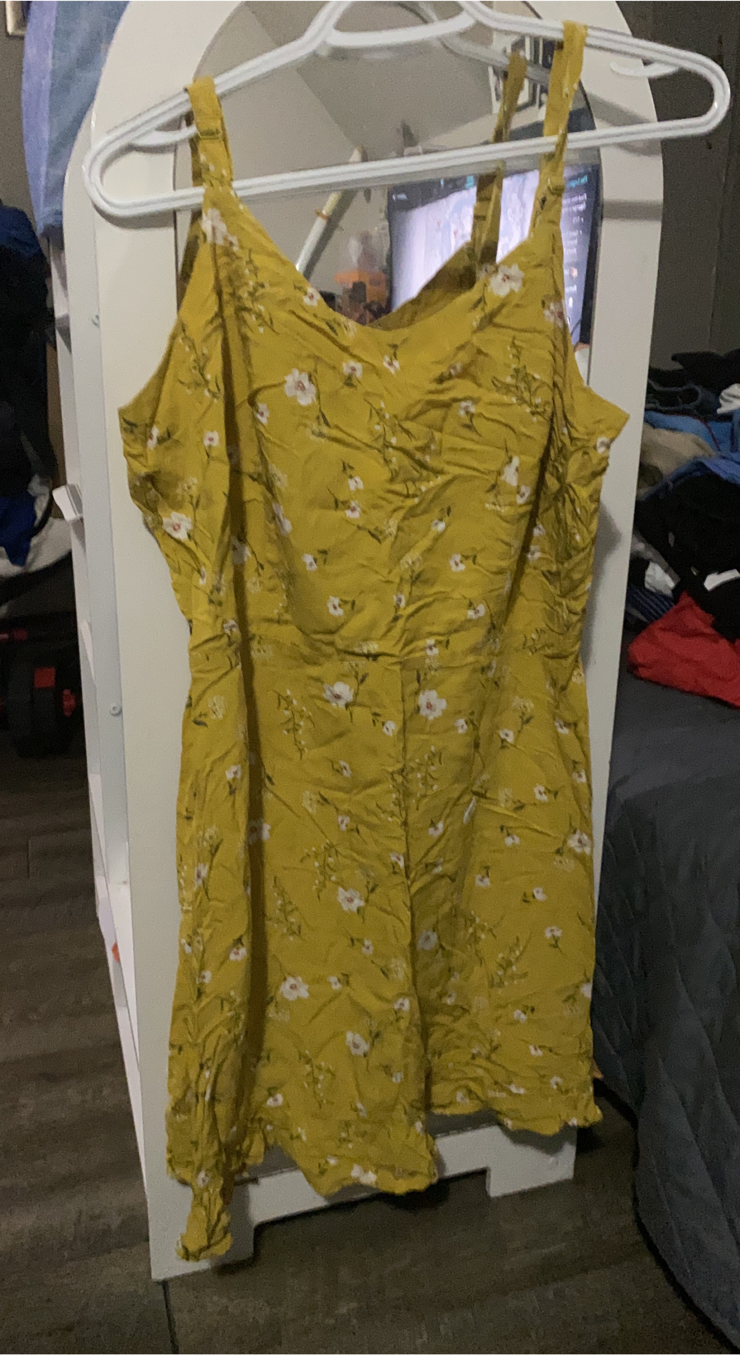 A cute yellow sundress with a floral pattern! Perfect for summer days or a casual outing. It's in great condition and ready for a new home