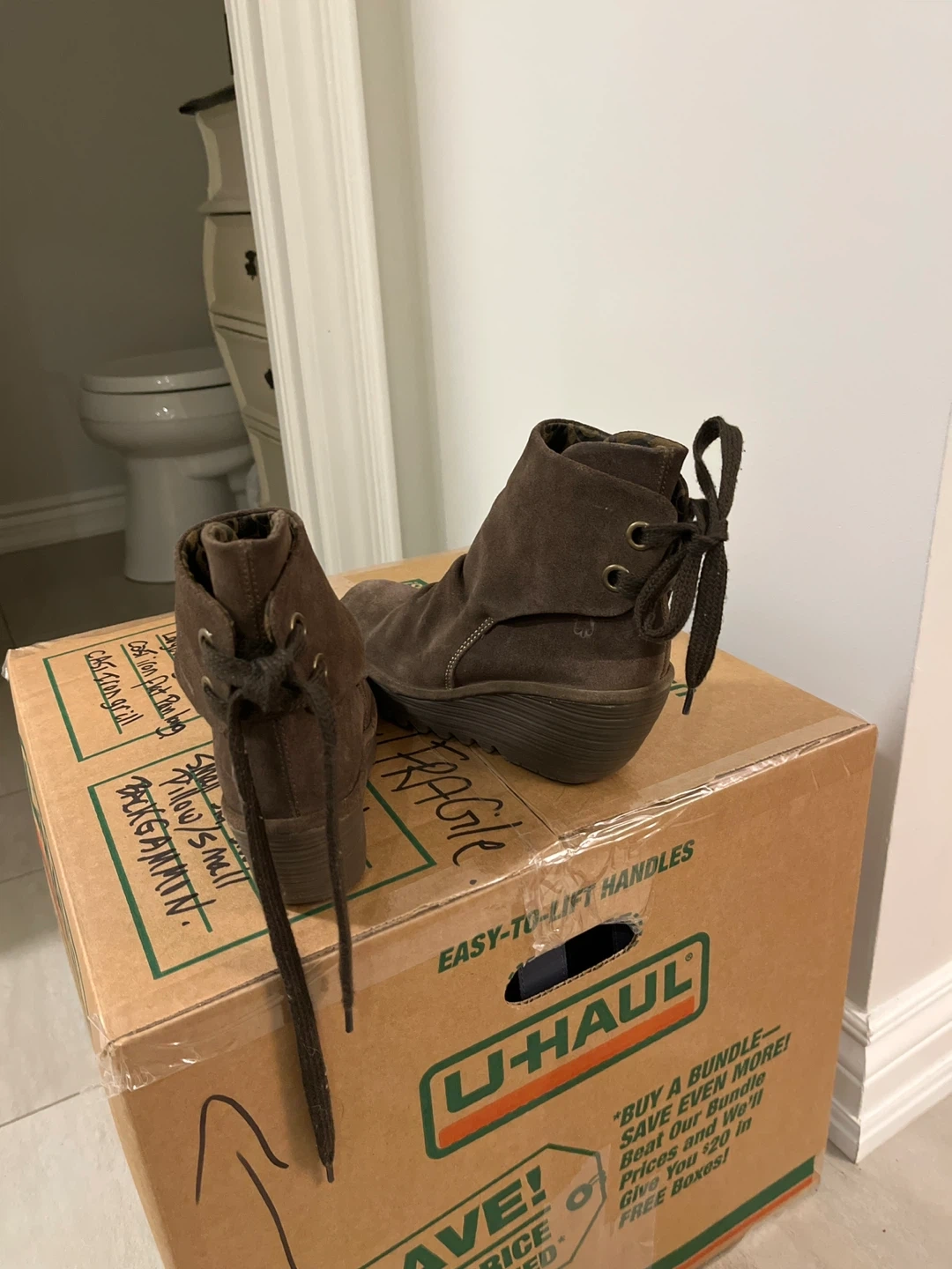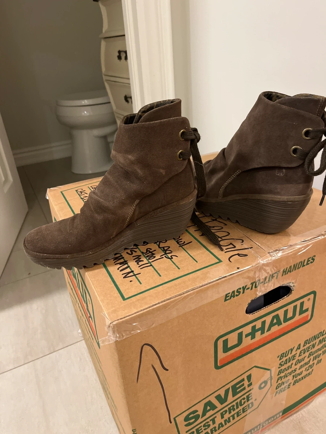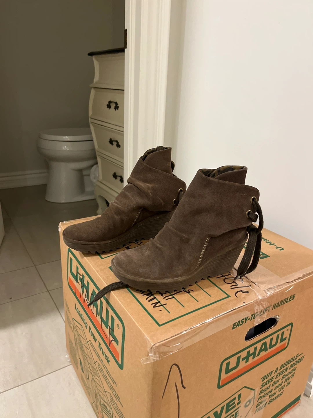 Fly London ankle boots in a lovely brown suede. These have a comfortable wedge heel and a stylish, unique design. Perfect for adding a bit of flair to your everyday outfits!