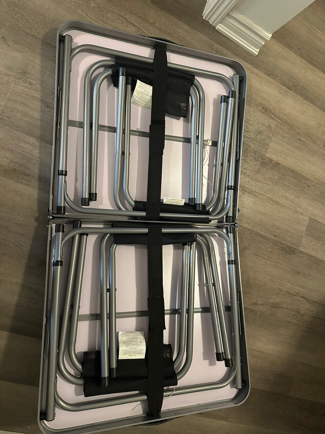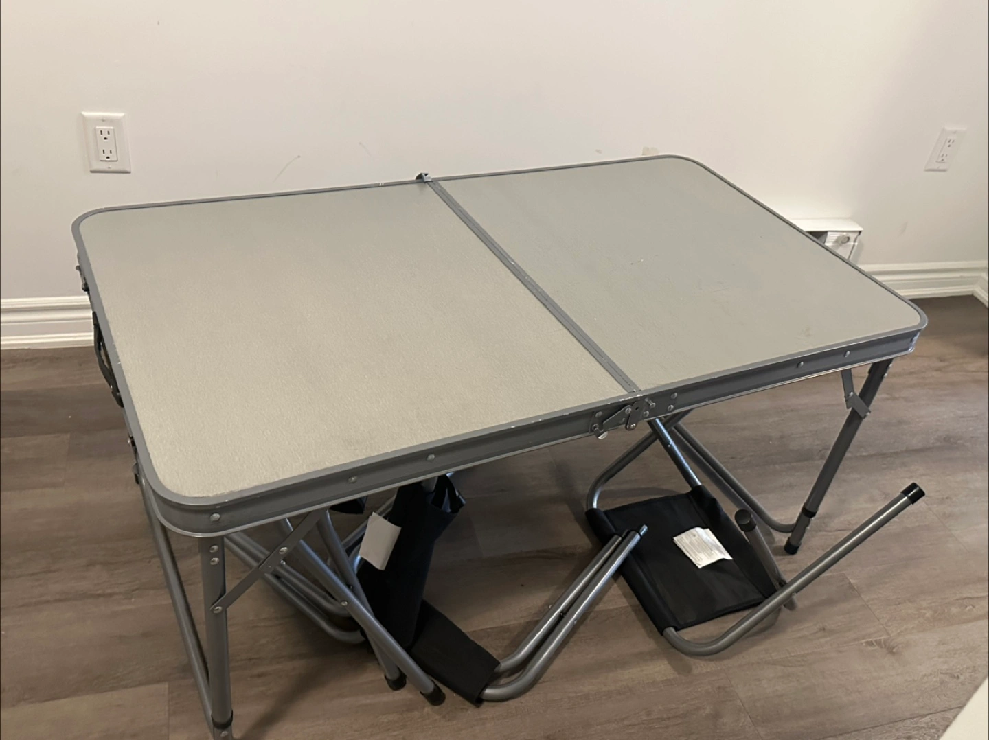 Selling a folding camping table that comes with four chairs. It's perfect for camping, picnics, or even just extra seating in your backyard. The table and chairs fold up for easy storage and transport, making it super convenient for any outdoor adventure! Height can be adjusted from 2 to 4 feet.