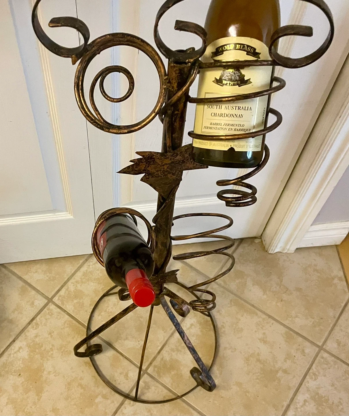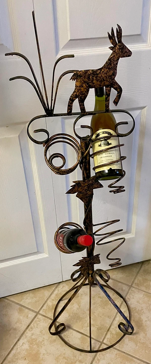 Selling a unique folk art style metal wine rack that holds 4 bottles. It has a decorative deer accent at the top and a rustic bronze finish. Perfect for adding a touch of charm to your dining area or bar! Tap to see enlarged picture.
