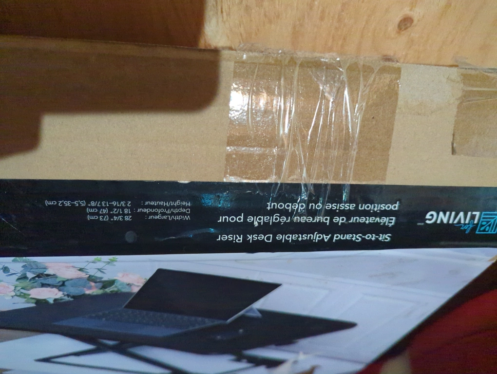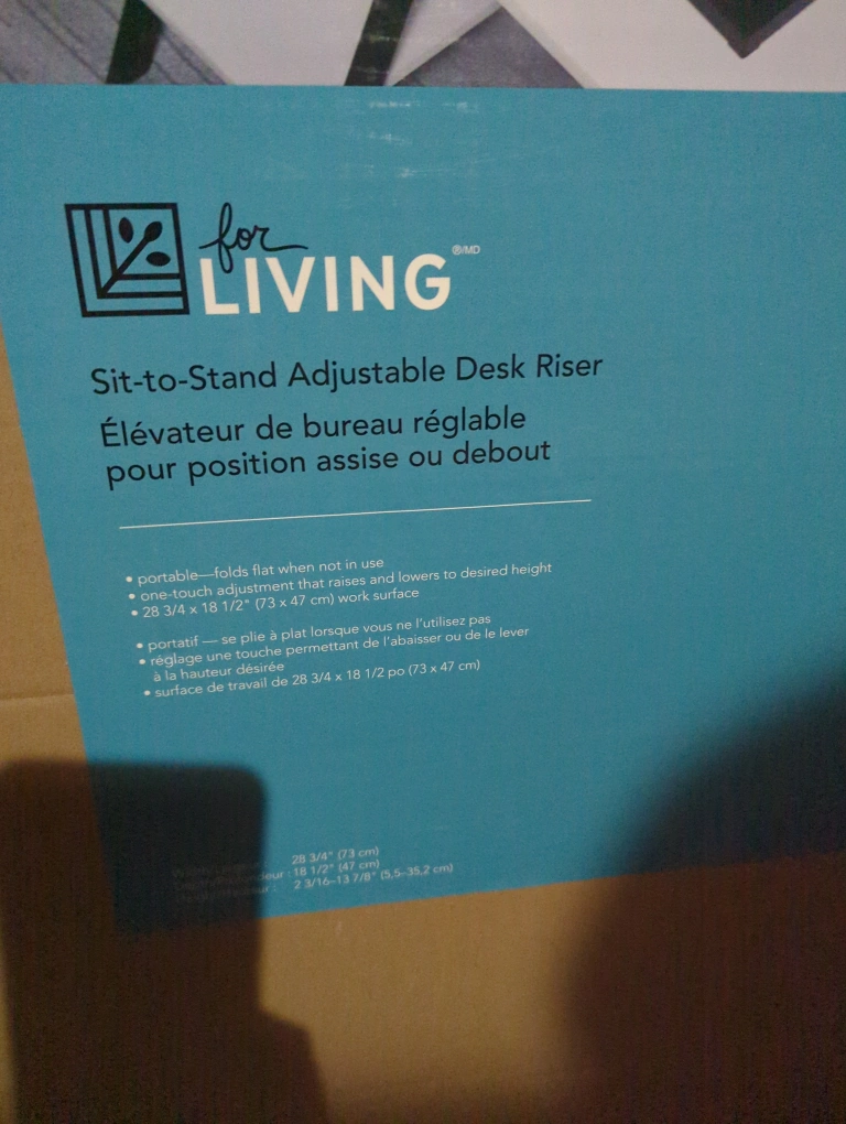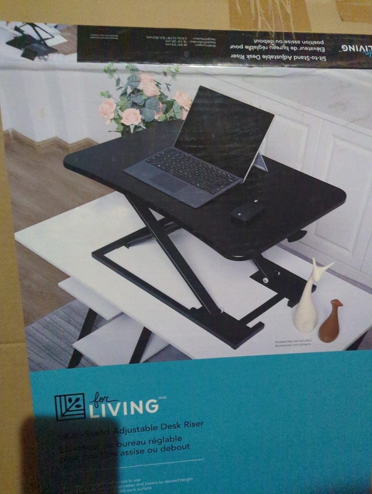 Selling a brand new For Living Sit-to-Stand Adjustable Desk Riser! It's still in the box and has never been used. Key features: - Portable and folds flat when not in use - One-touch adjustment that raises and lowers to your desired height - Work surface measures 28 3/4" x 18 1/2" (73 x 47 cm)