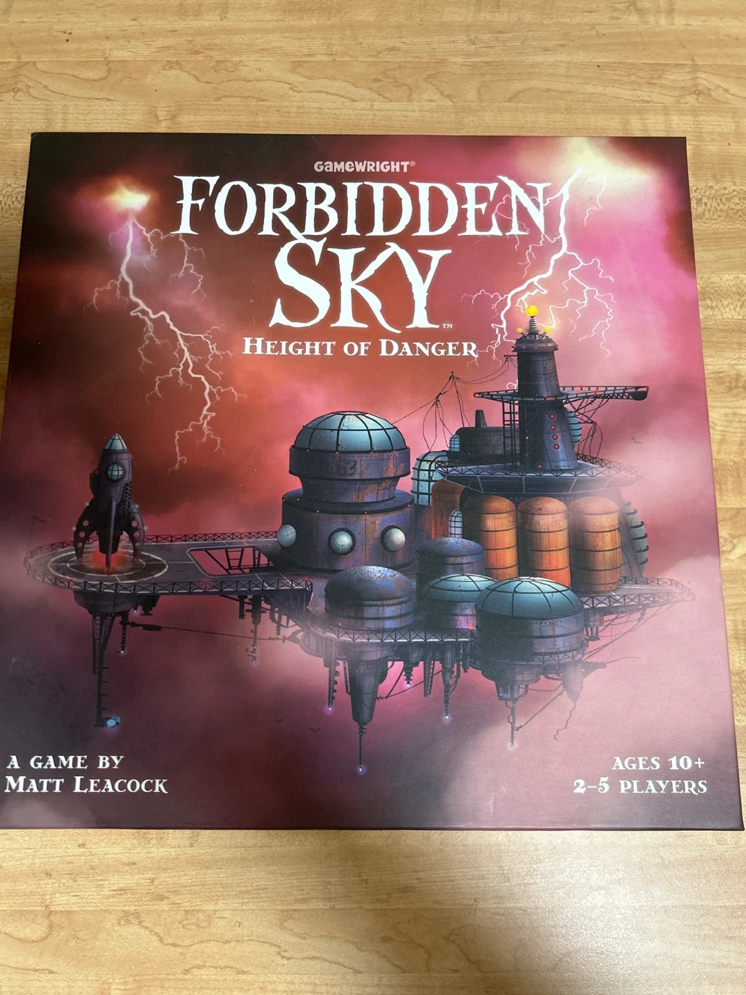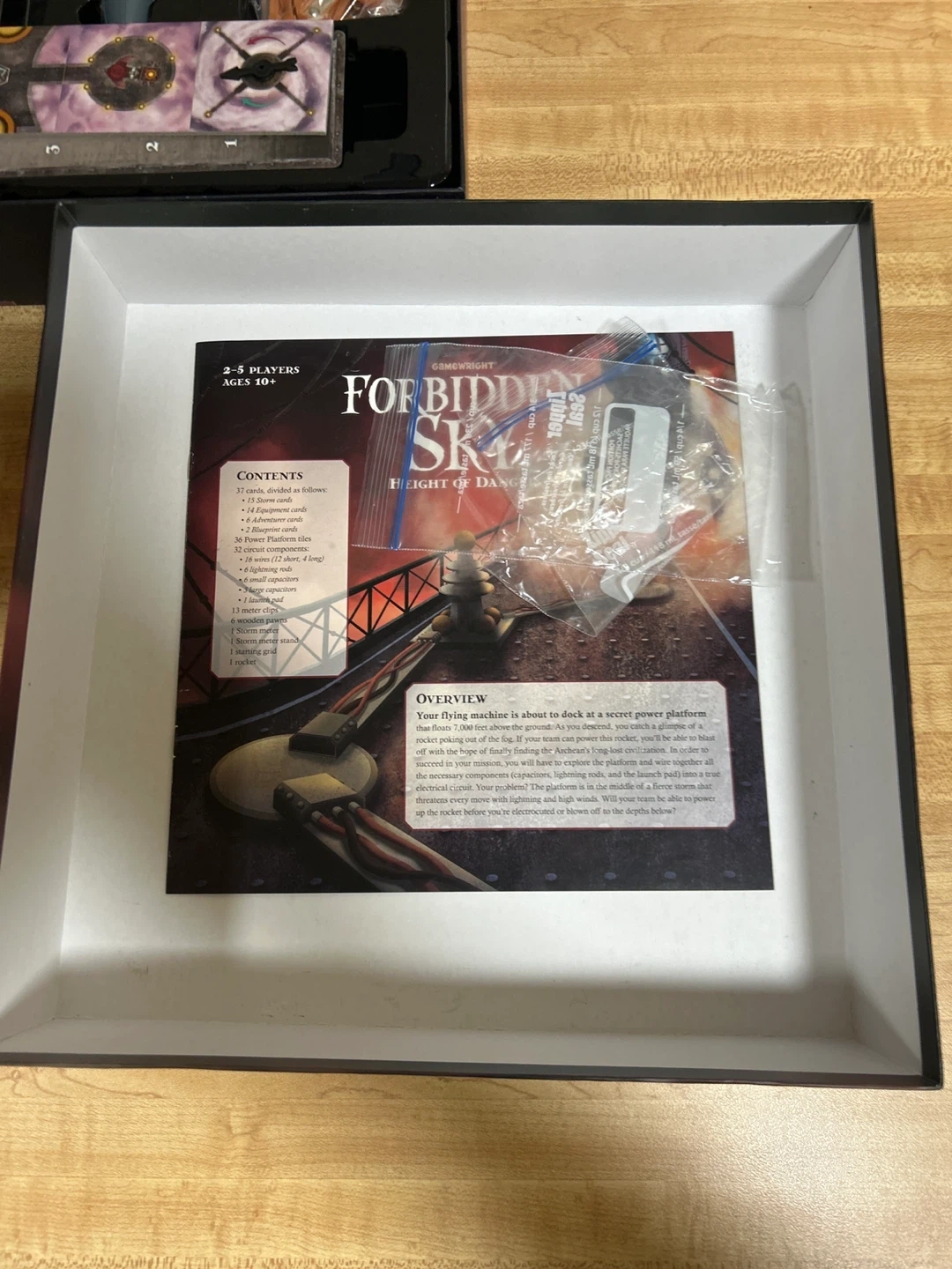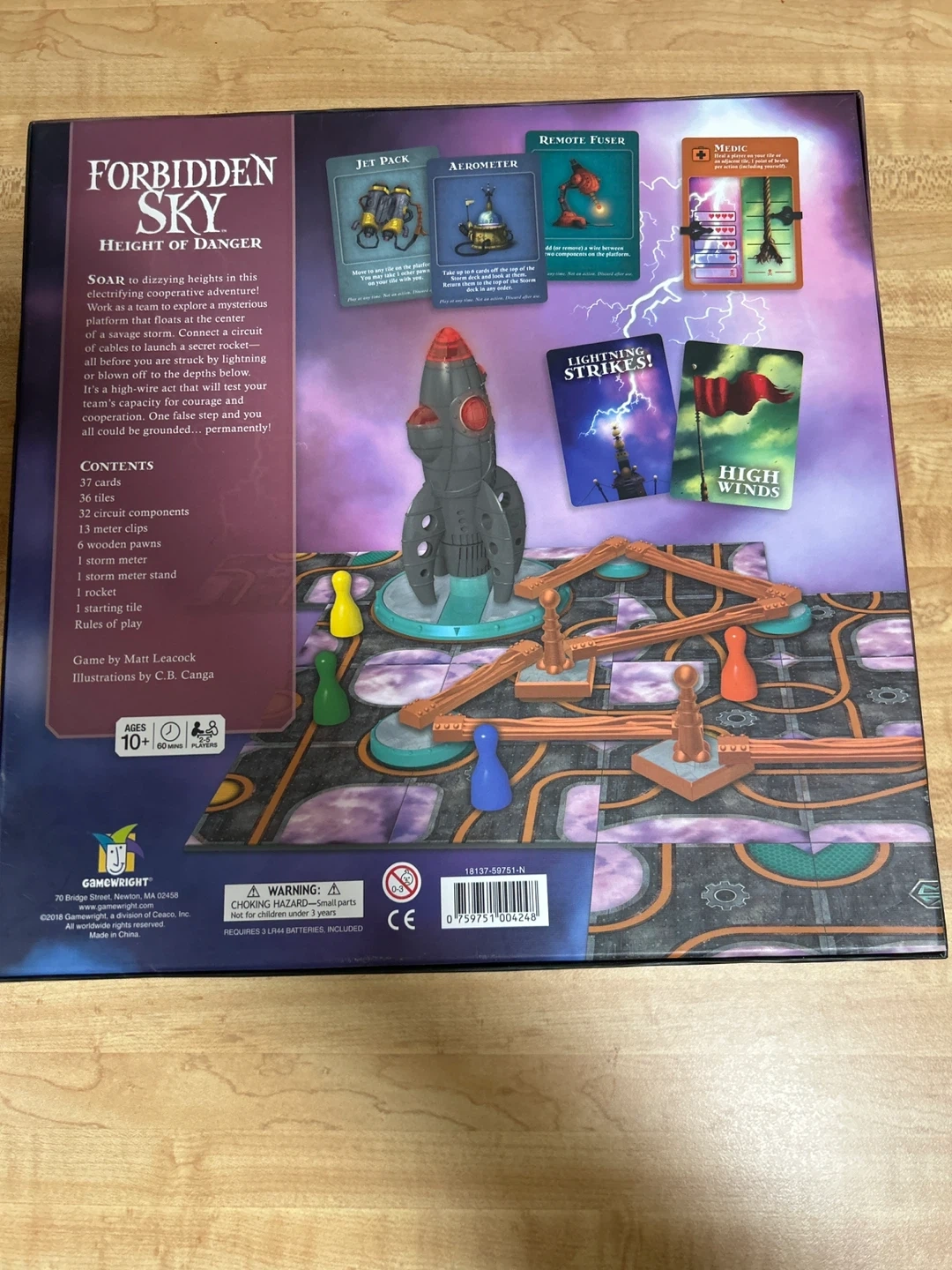 Looking to sell my Forbidden Sky board game by Gamewright. It's a cooperative game where you work together to launch a rocket! The game includes: - 37 cards - 32 circuit components - 6 wooden pawns - 4 storm meters - 1 storm meter stand - 1 rocket - Floating tile - Rules of play Recommended for ages 10+ and 2-5 players