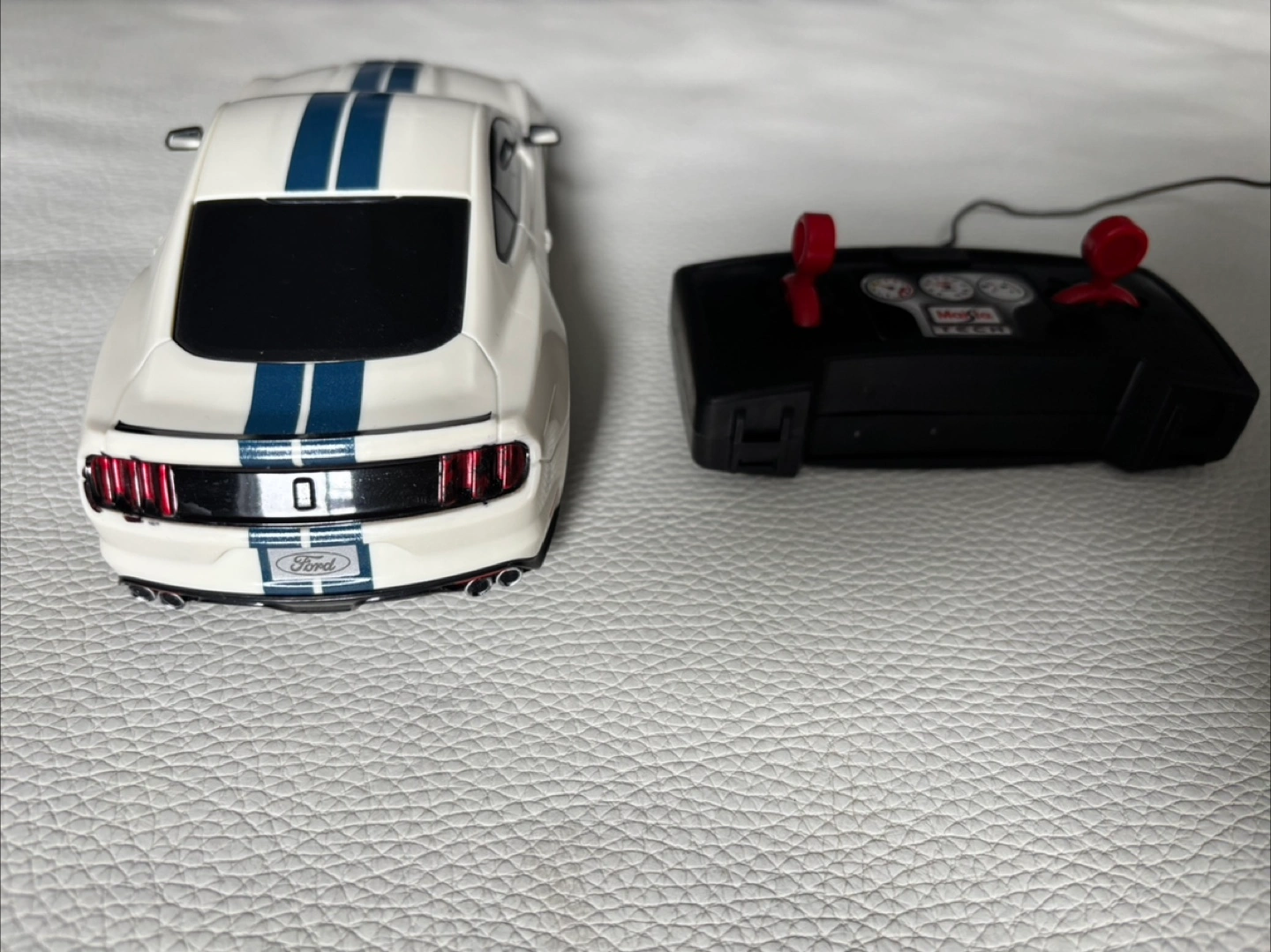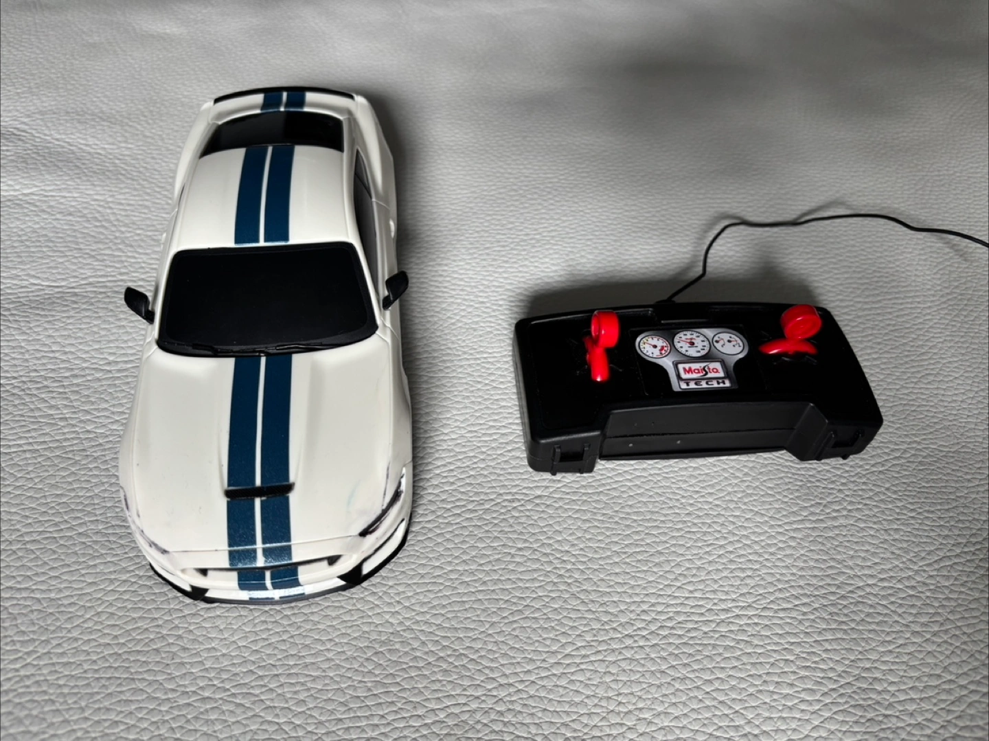 Selling a Ford Mustang GT remote control car made by Maisto Tech! It's white with blue racing stripes. Comes with the remote control. Model #81016 Needs: 2 AA (car) & 2AA (controller) Batteries not included