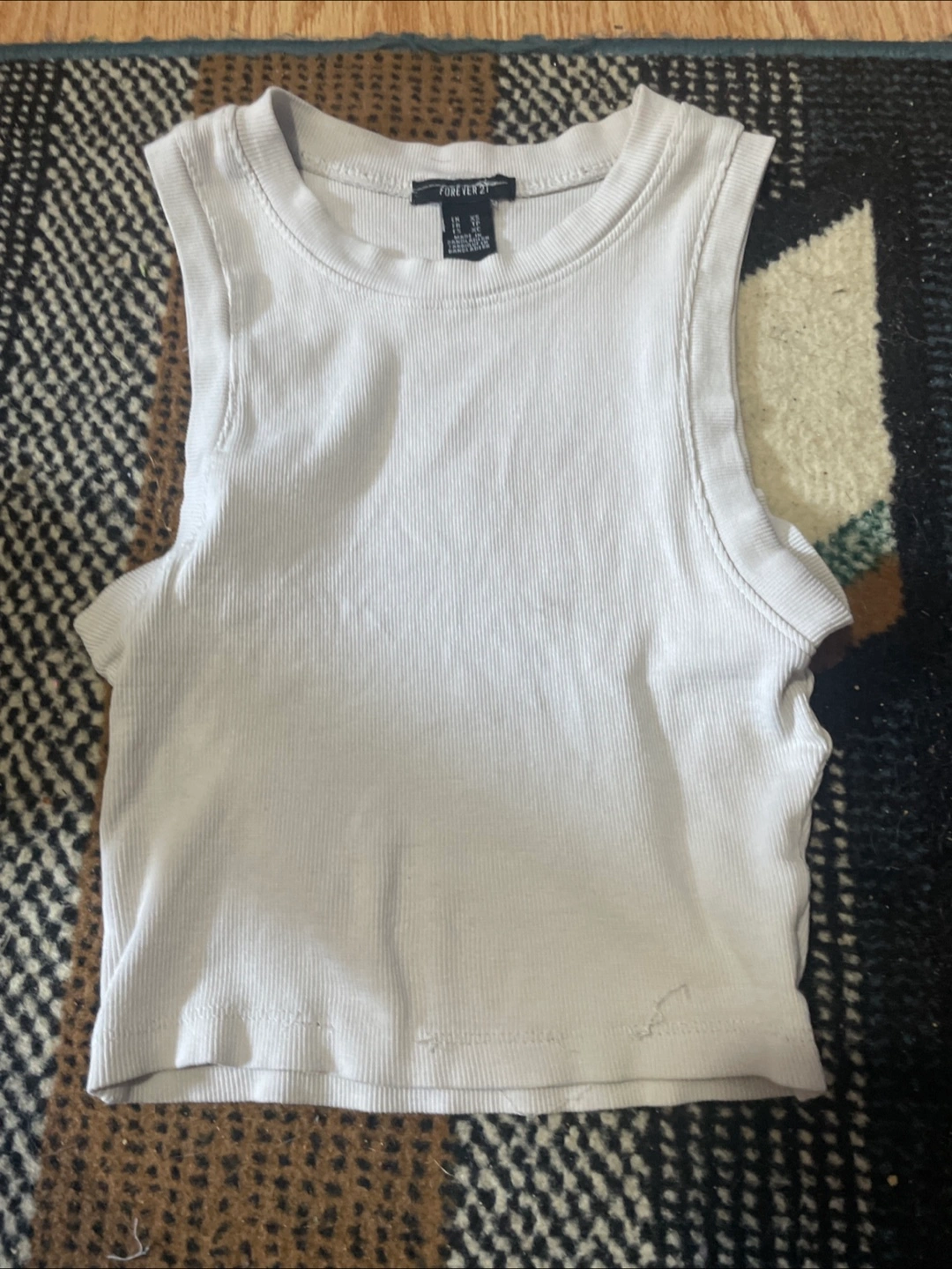 Selling a Forever 21 white tank top in size XS. It's in great condition and ready for a new home! It's a ribbed material. Comfy material
