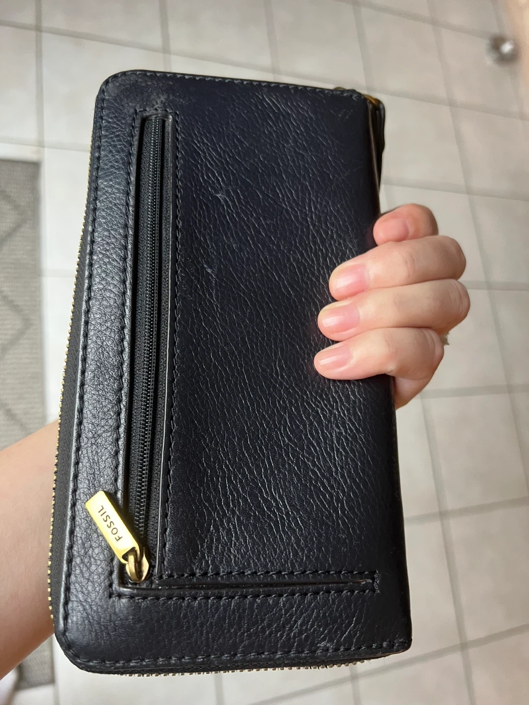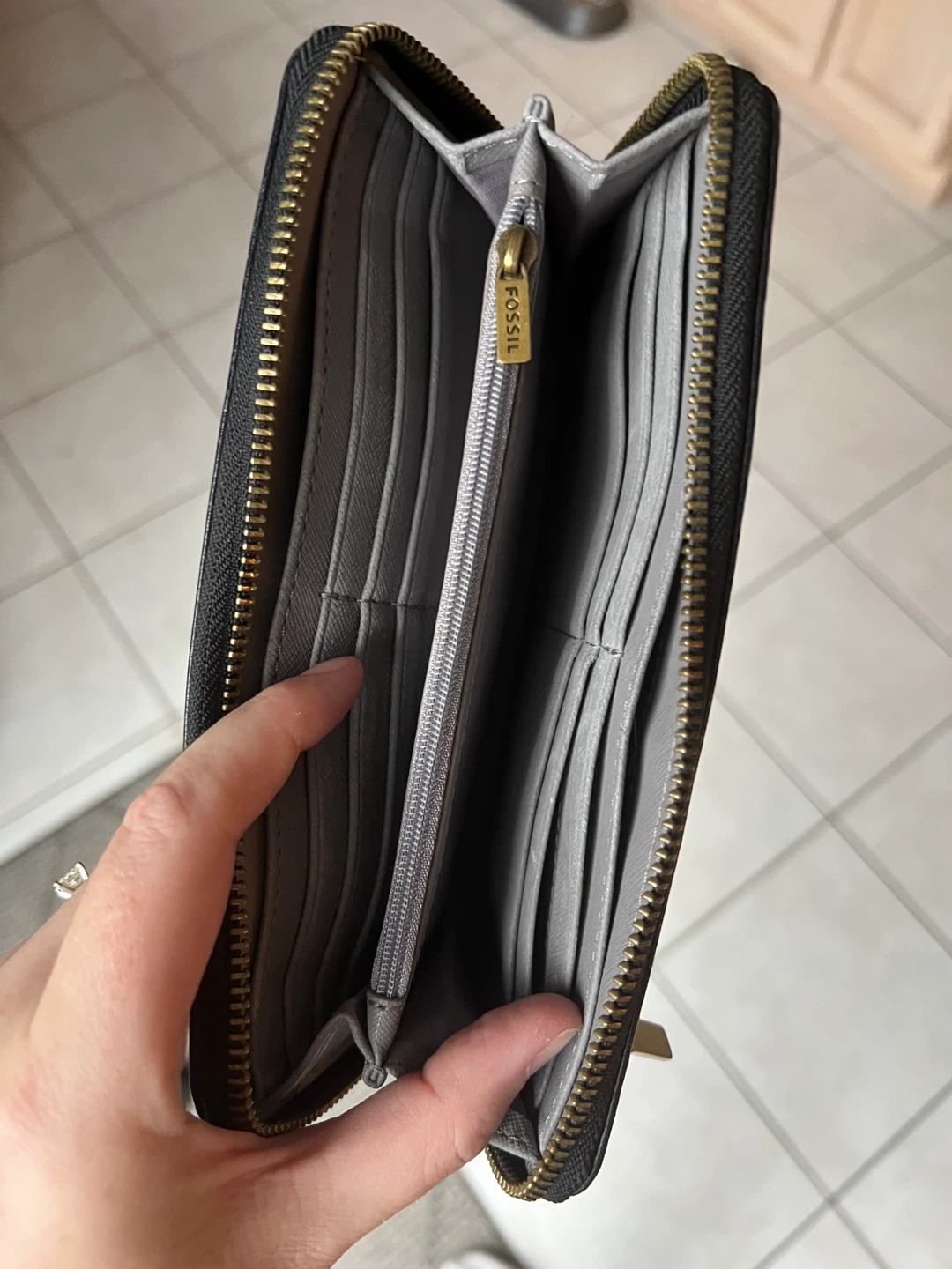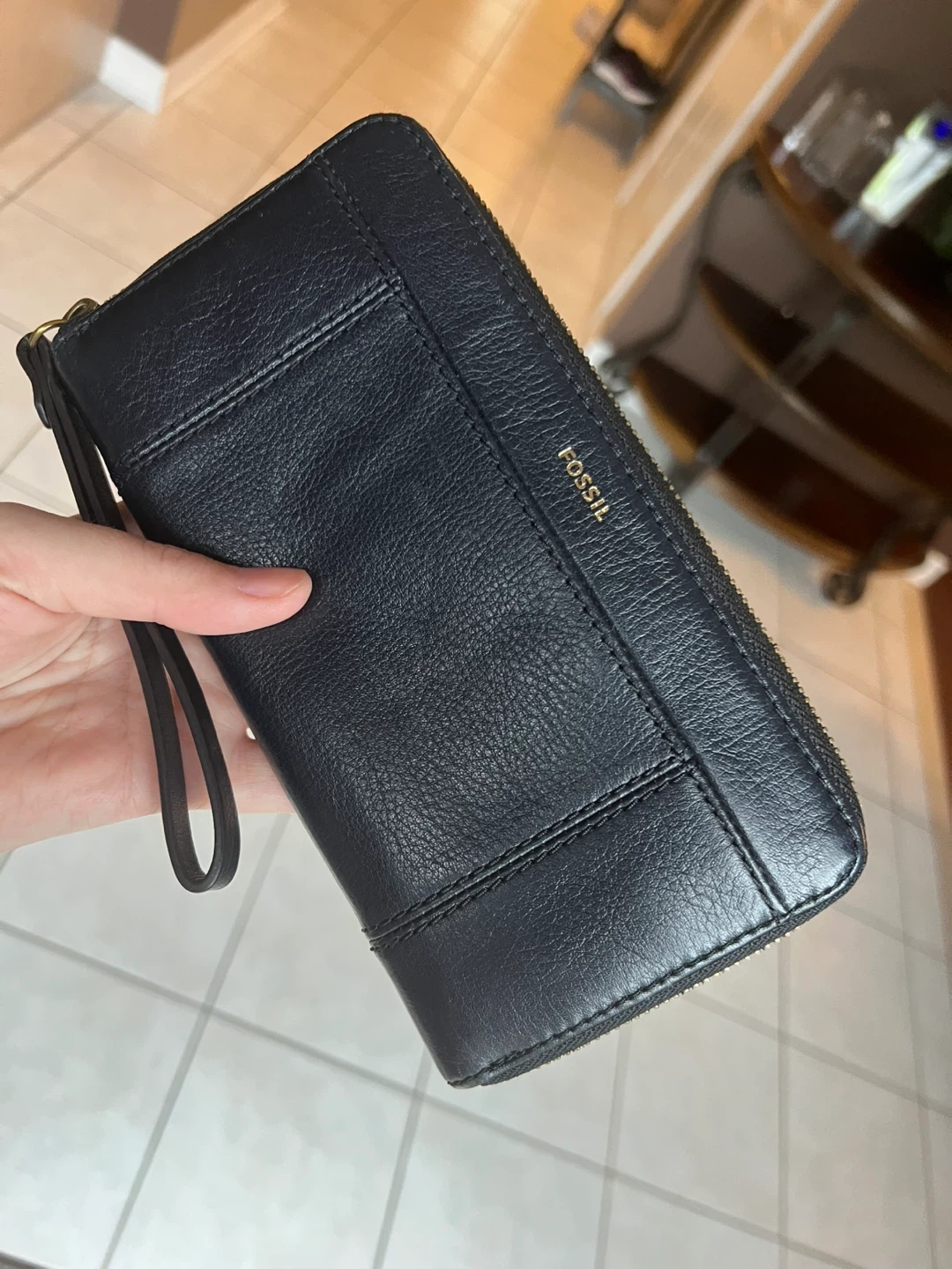 Selling a gently used Fossil wallet. It's black leather with a zip closure. Plenty of card slots and compartments inside to keep everything organized!