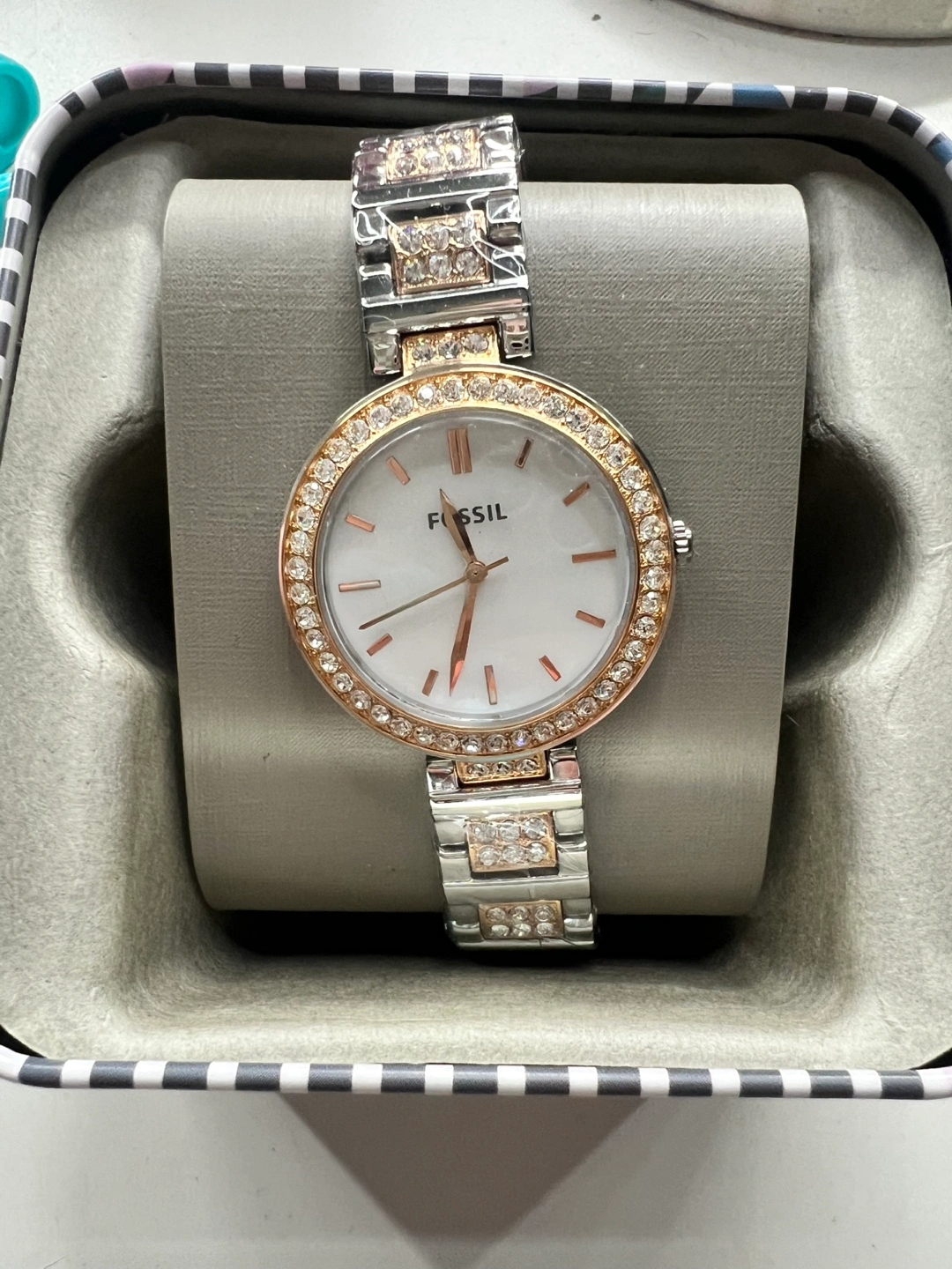 Selling a lovely Fossil ladies' watch! It features a silver and rose gold design, with some sparkly details. The watch comes with its original box.