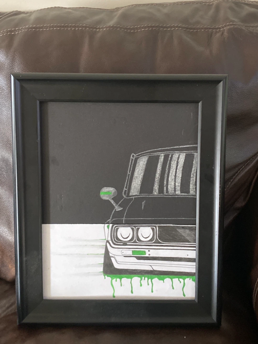 Here's a framed art print of a car. The frame is black and the drawing features a car in black and white with green accents. It's in great condition and ready to add some character to your space