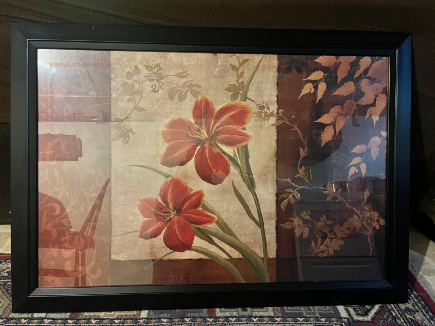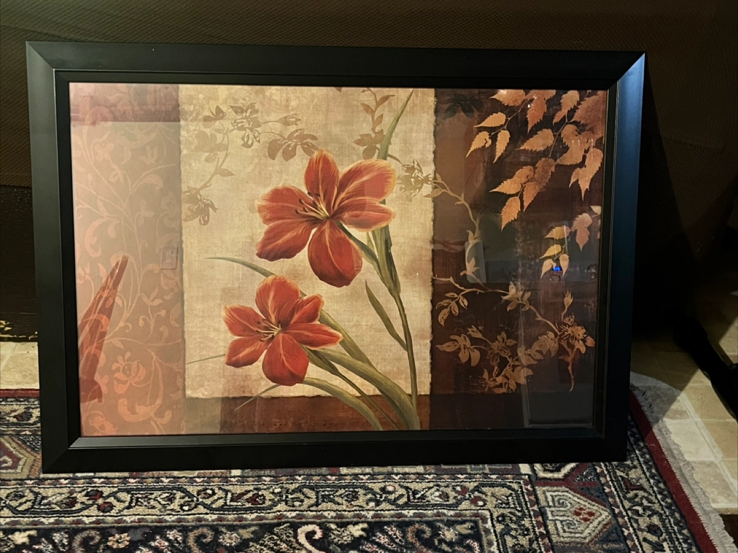 A framed floral print featuring red flowers with brown and beige accents. It’s a nice piece of wall art to add a touch of nature to your space