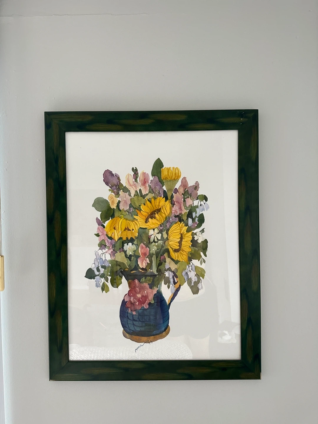 Selling a framed watercolour painting featuring a beautiful floral arrangement in a blue vase. The frame is a dark green colour and the dimensions are 69cm x 87cm. It's a lovely piece to brighten up any room!