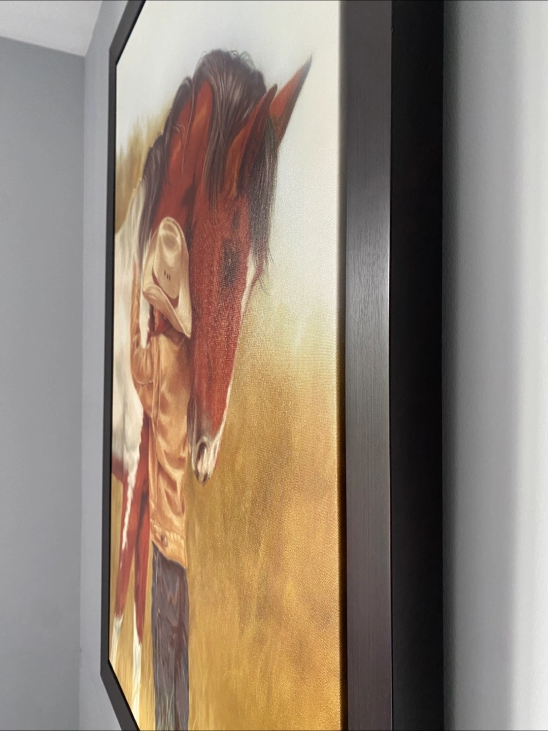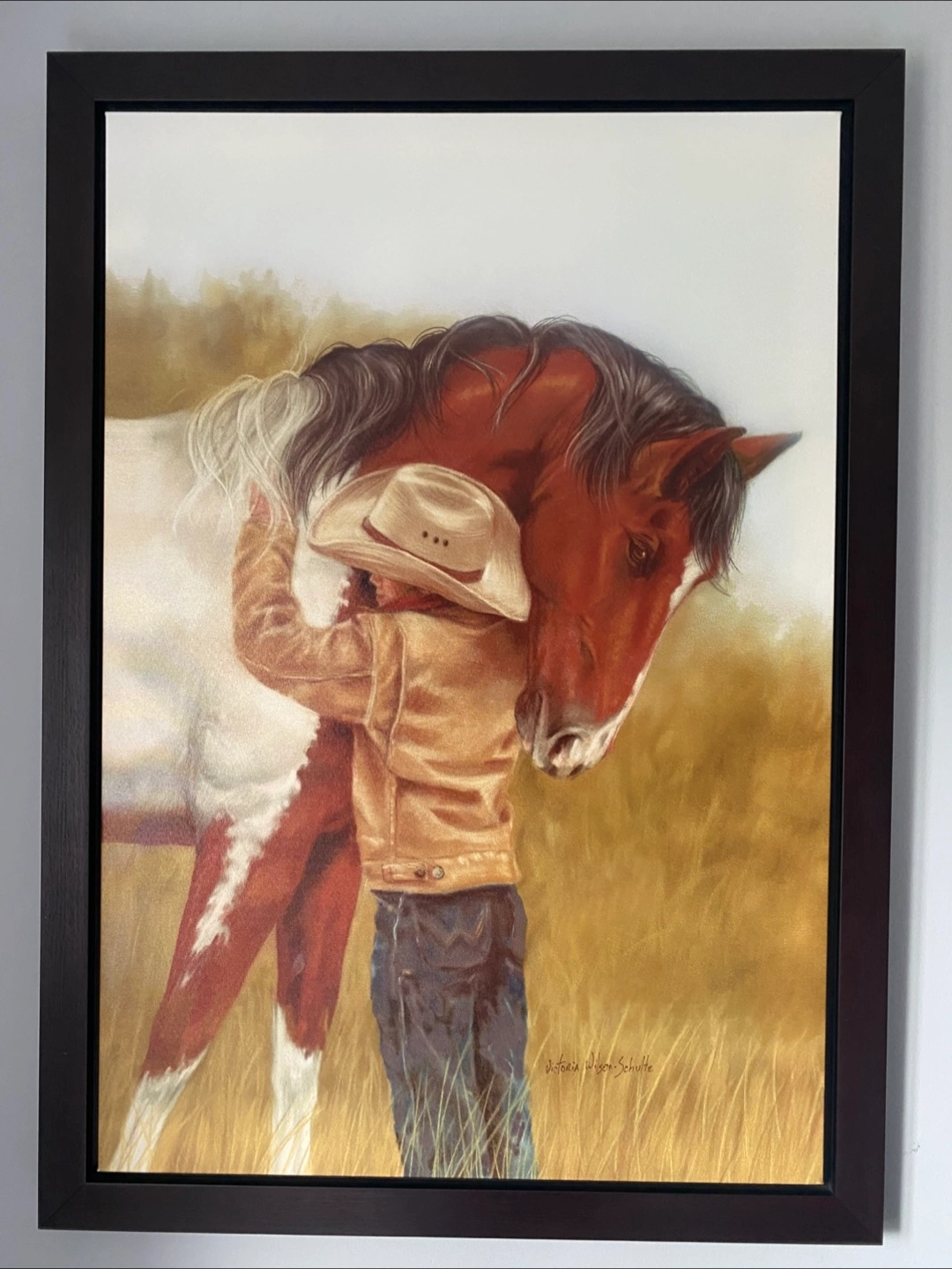 Beautiful framed art print featuring a cowboy and horse. The frame is a dark wood tone and the print is in excellent condition. The dimensions are approximately 28 inches wide and 42 inches tall. Perfect for adding a touch of western charm to your home! Pick up in Orléans