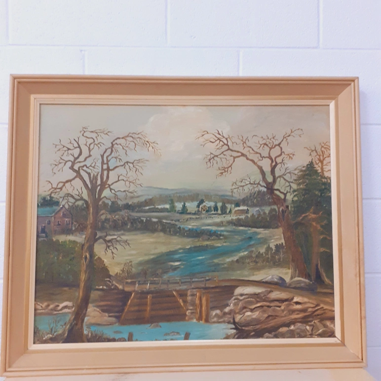 Framed oil painting of a landscape with trees, river and a wooden bridge.