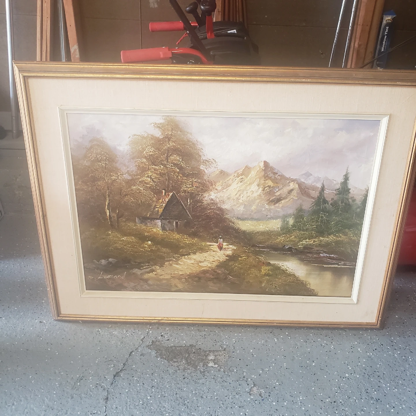 47 x 35 inch framed painting of cottage and mountain by stream. Buy it for the frame only if you don't like the picture. Supposedly worth $75