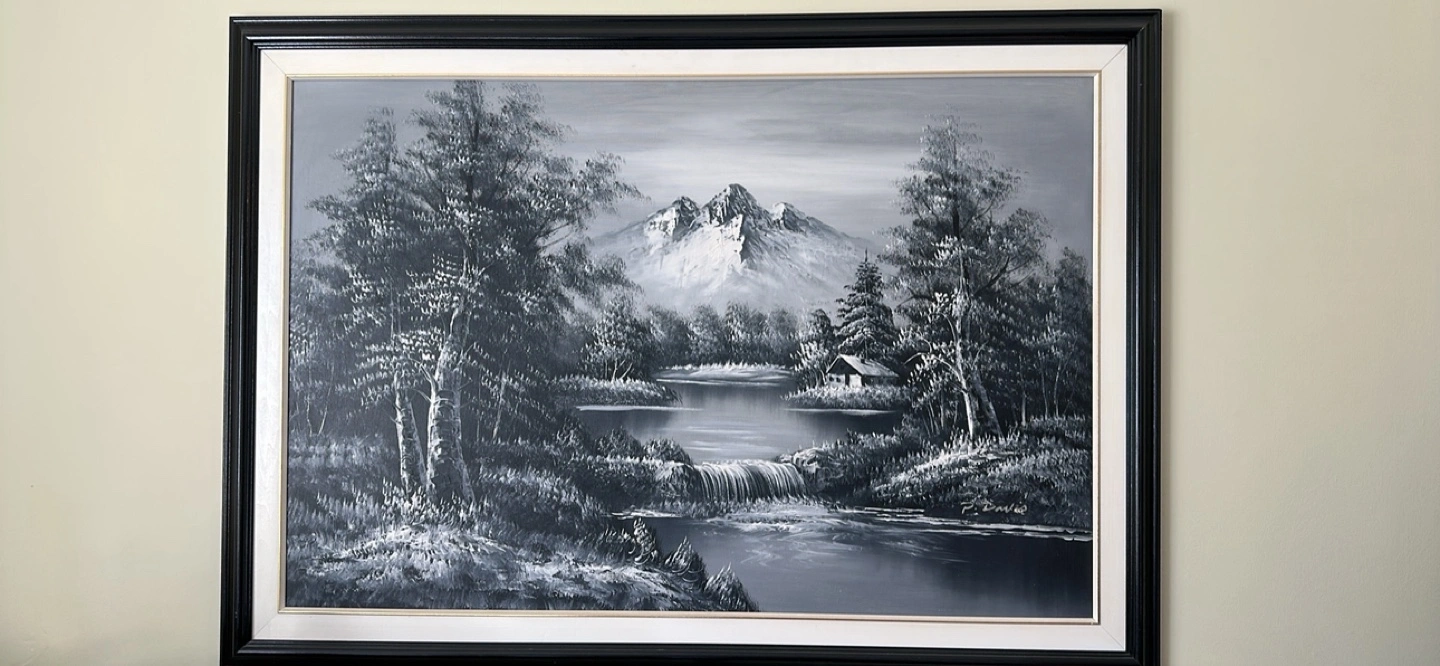 Beautiful framed painting. Depicts a serene landscape scene. Features mountains, trees, a river, and a small cabin. Monochrome palette. Black frame with off-white inner frame.