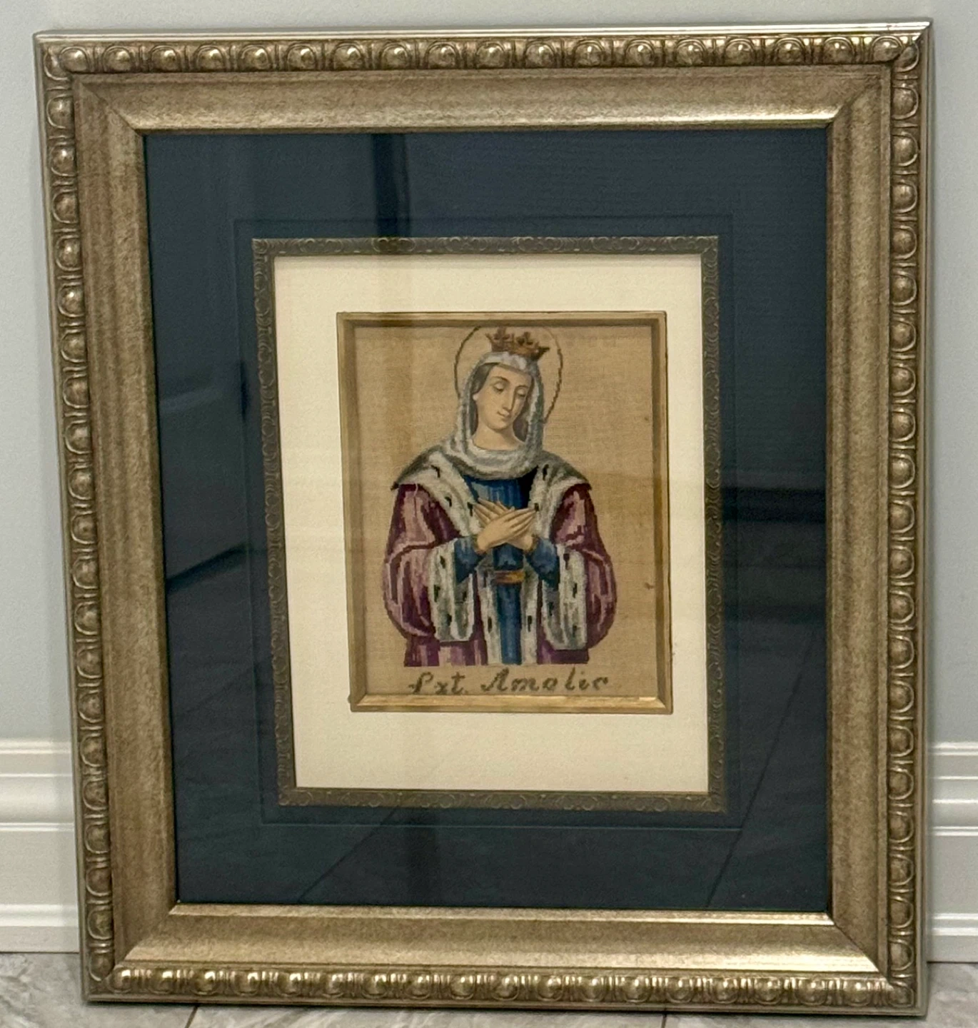 Selling a framed needlepoint piece featuring what appears to be a portrait labelled 'Pat Amalie'. The frame has a decorative gold finish and the artwork is behind glass. It's a unique piece for adding a touch of vintage charm to your home decor