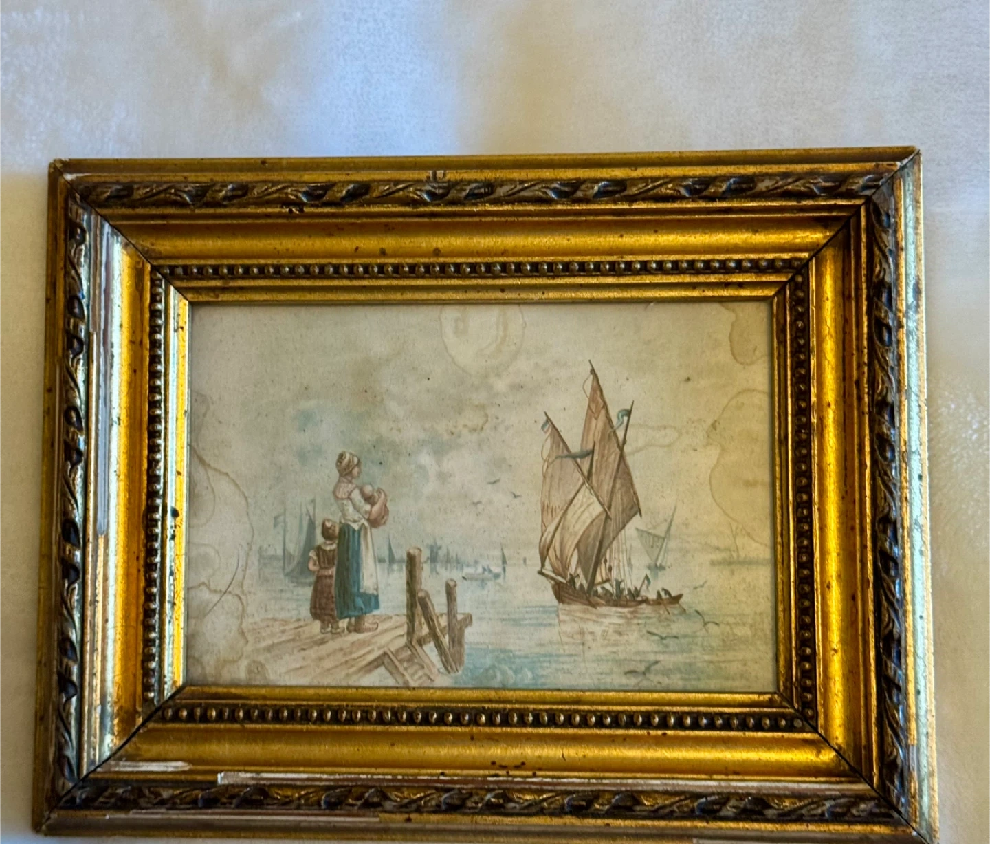 A framed painting depicting a harbour scene with figures on a dock and sailing ships. The frame is gold-toned and ornate. Could be a nice addition to your home decor!