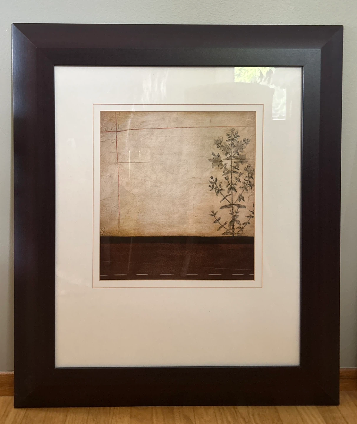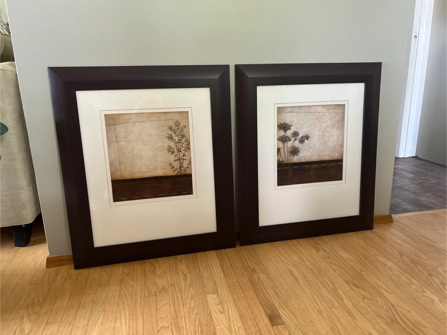 Selling a set of two framed wall art pieces. They have a lovely neutral colour palette with botanical prints, perfect for adding a touch of nature to your home decor. The solid wood frames are a dark brown colour. Each piece measures about 24” wide by 28” high.