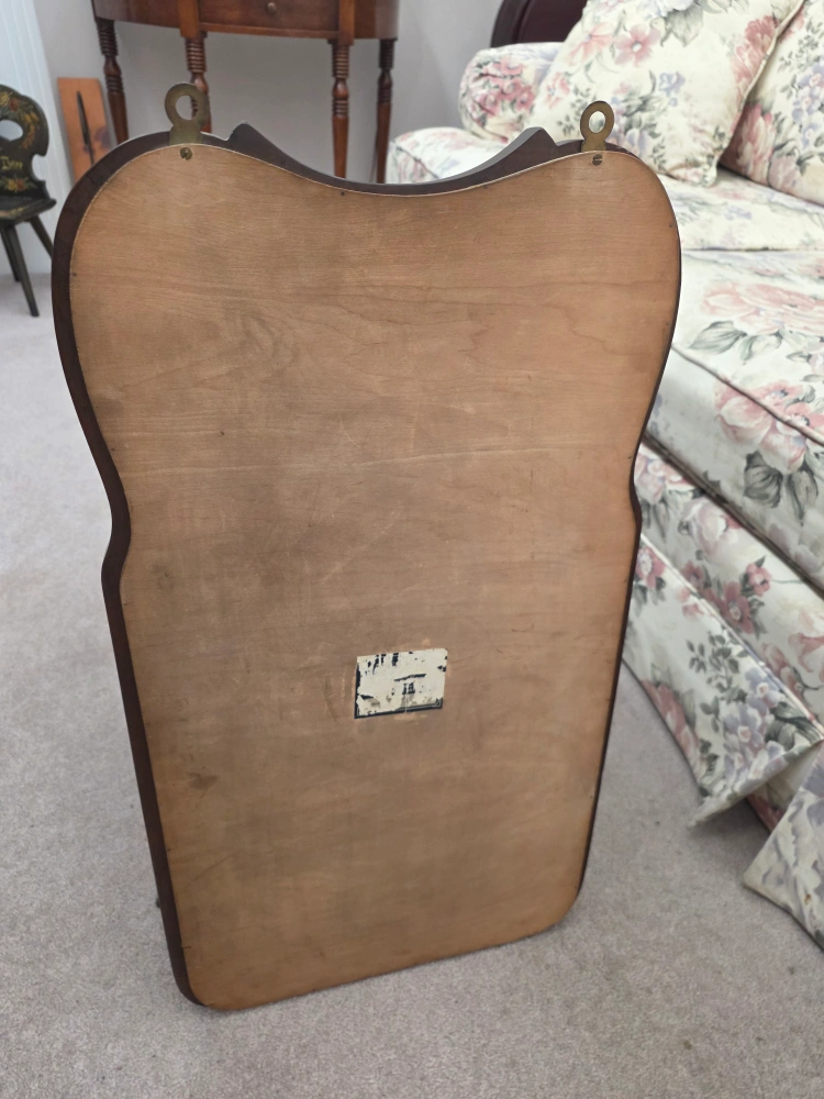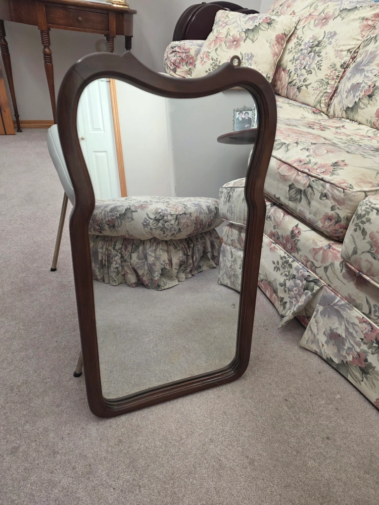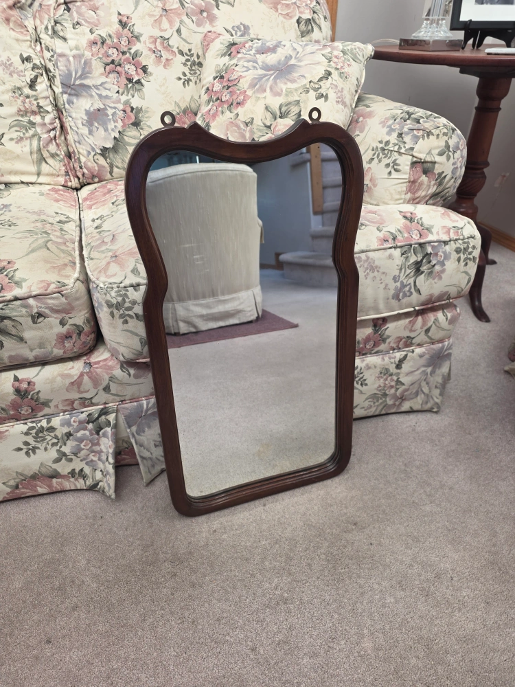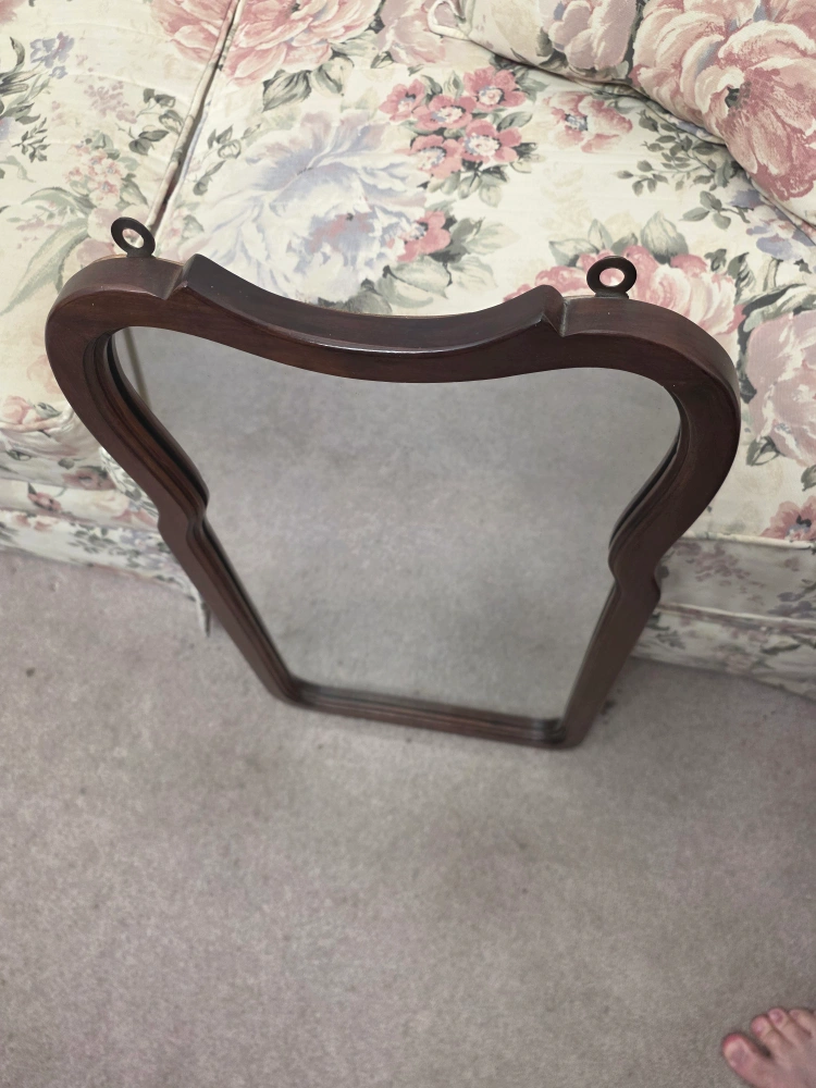 Selling a framed wooden mirror. It's in great condition and would look lovely in any room. The frame has a unique shape that adds a touch of elegance!