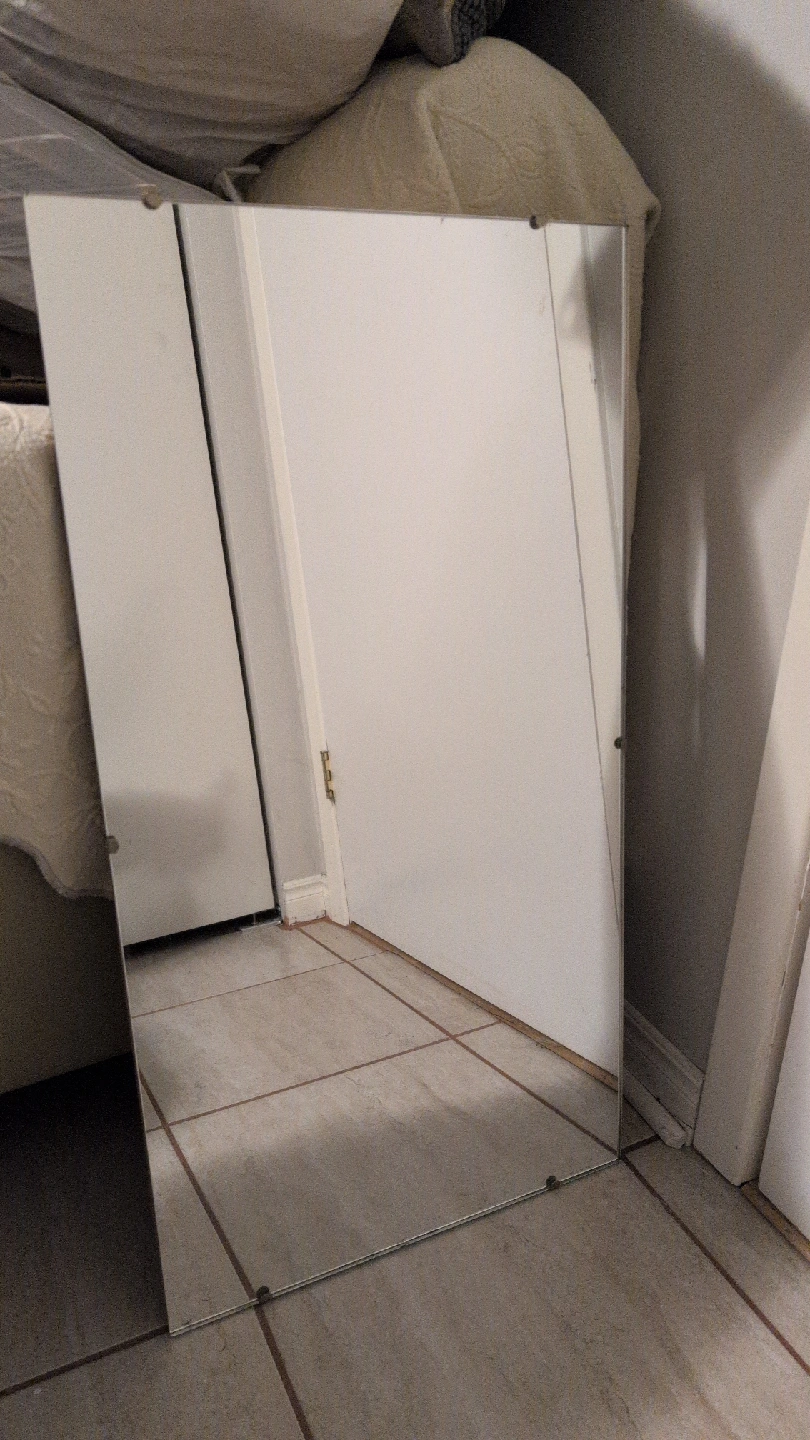Selling a frameless wall mirror! It's in good condition and ready to brighten up any space. Perfect for a bathroom, bedroom, or entryway. It has a clean, modern look that will complement any decor. Has a small chip on the bottom, please see photos. Comes mounted on a half inch thick piece of wood. Quite heavy.