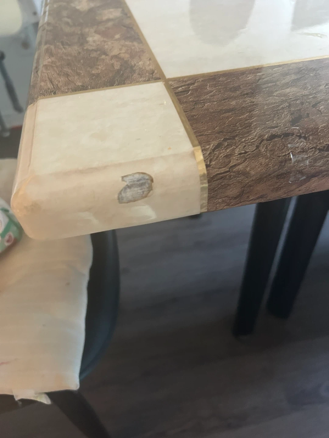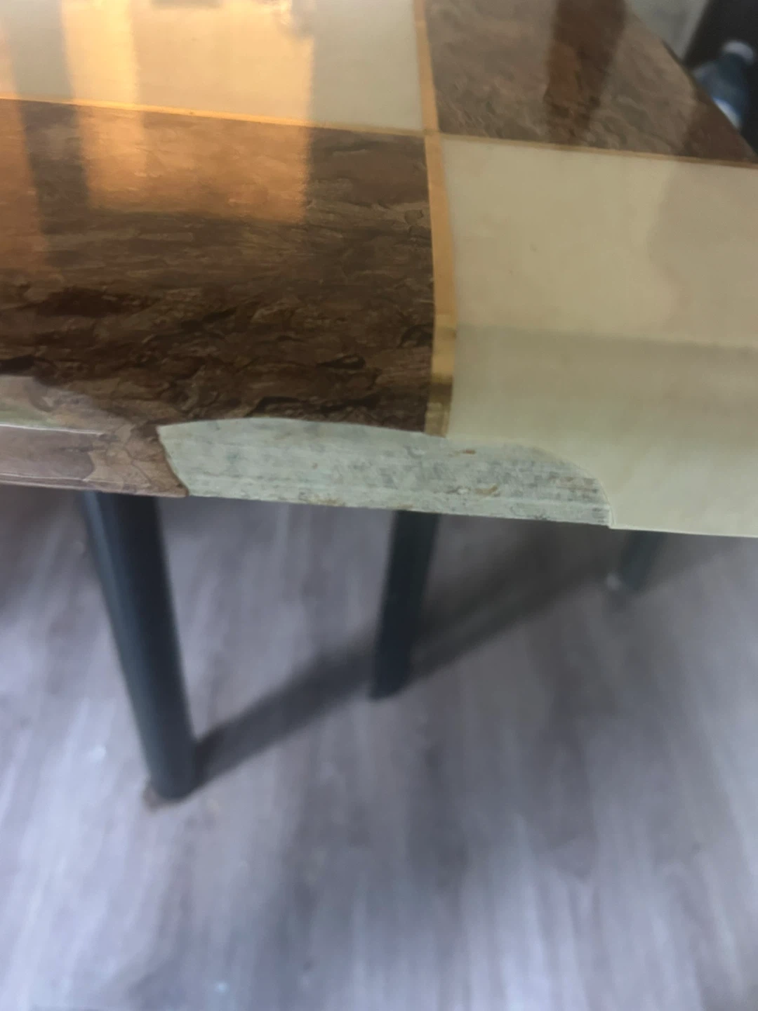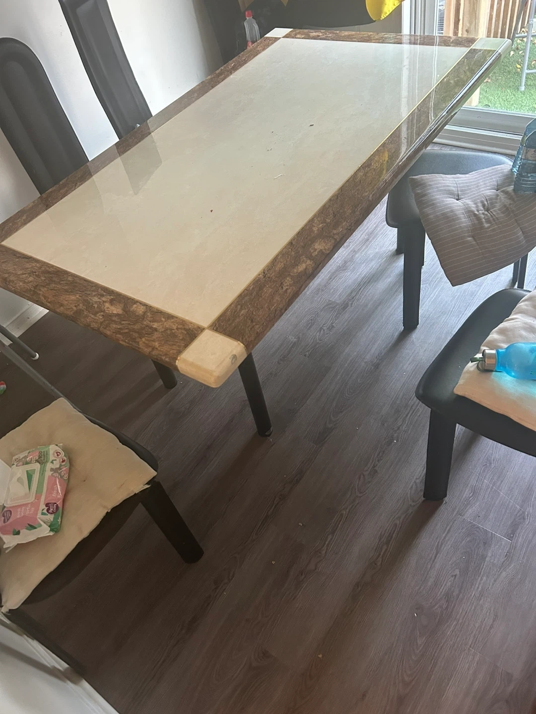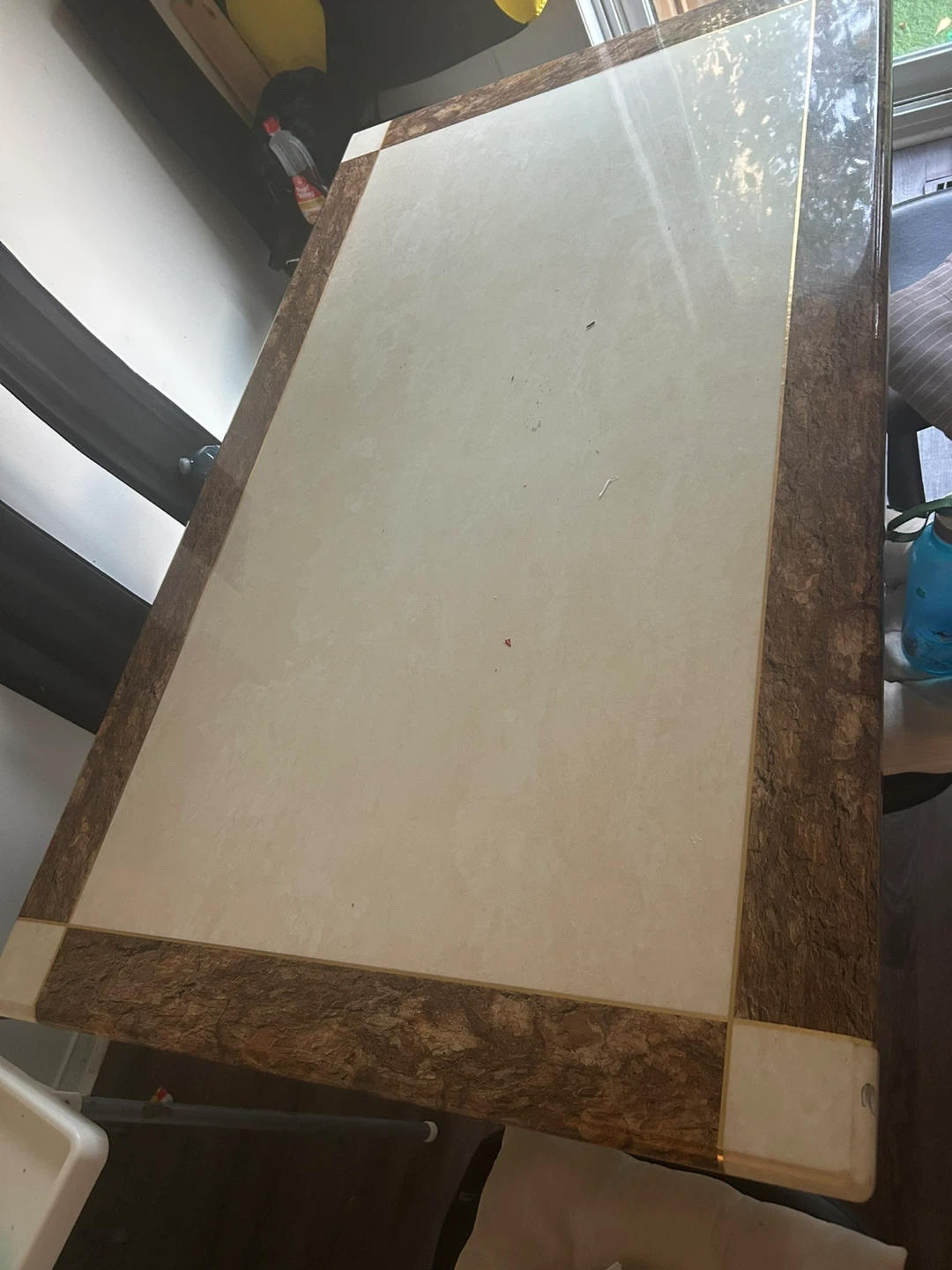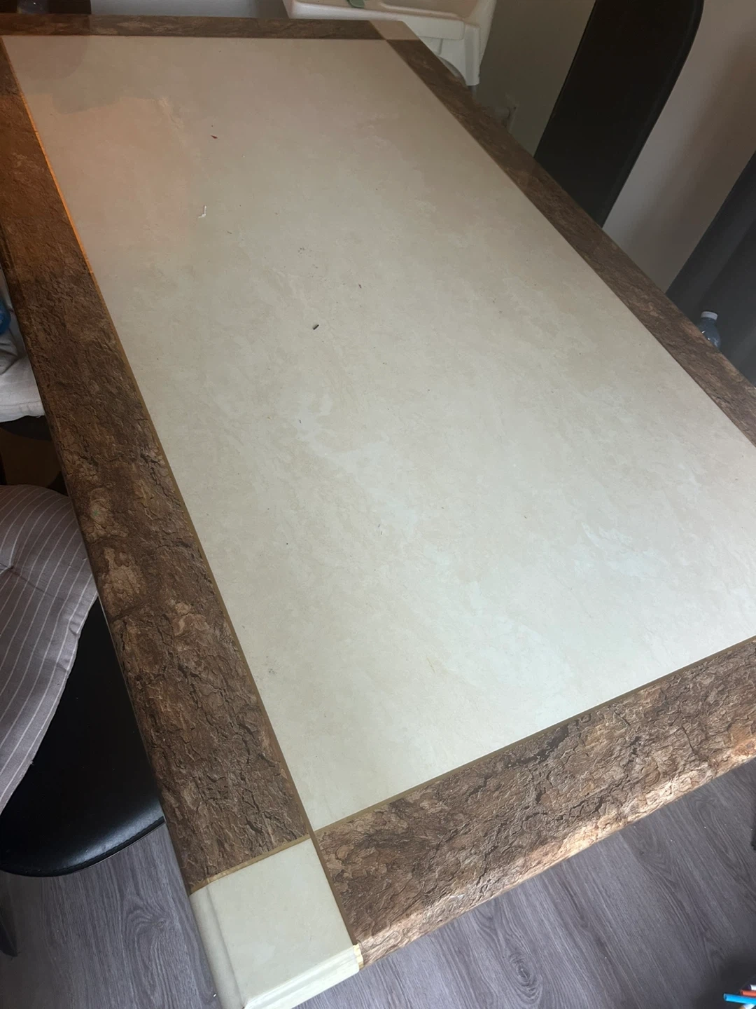 FREE ON CURB IN SCARBOROUGH Selling a dining table with a unique design! It measures approximately 59 inches in length and 35 inches in width. The table features a light-colored surface with a decorative brown border that resembles bark. Perfect for a dining room or kitchen space Heavy Fits six people Scarborough