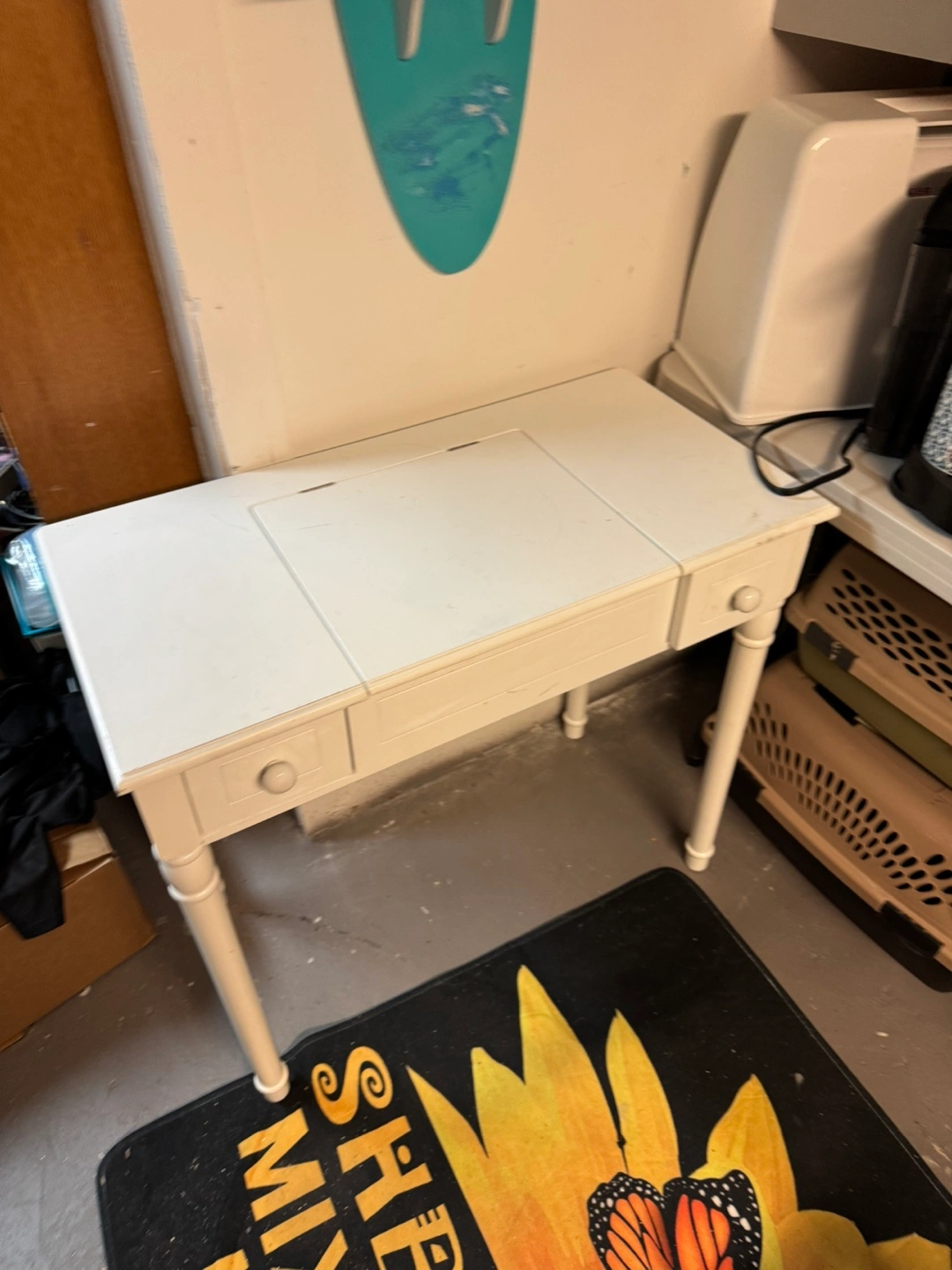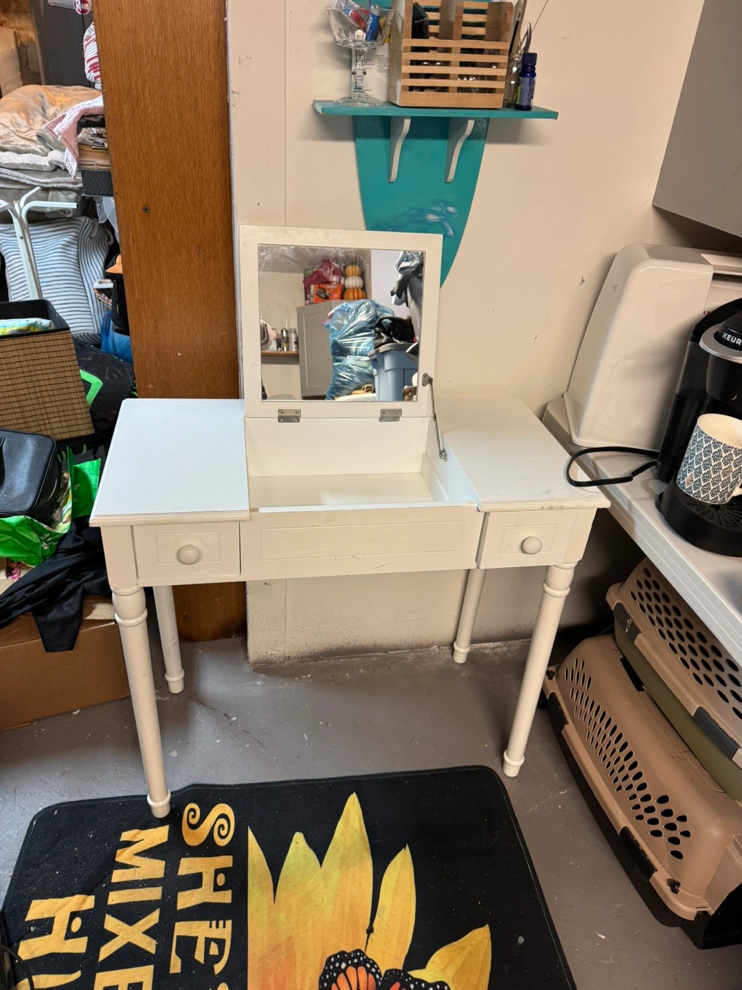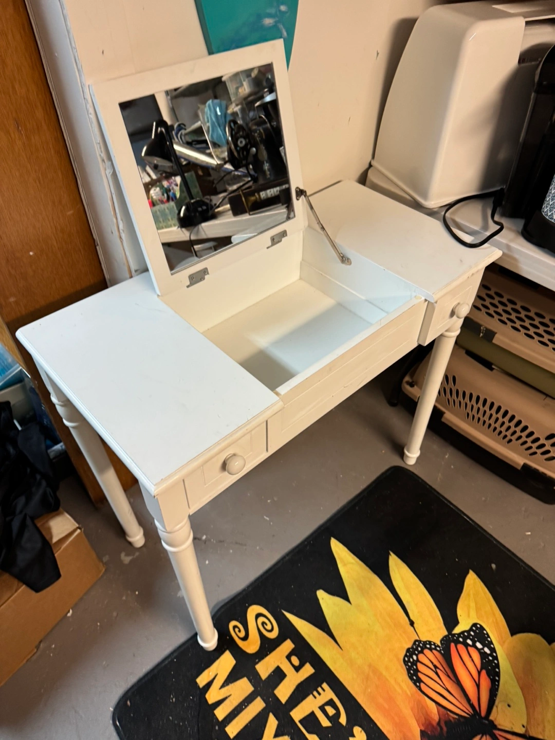 Adorable white vanity desk. Features a lift-top mirror and two drawers. Simple design, perfect for a bedroom or small space. Some minor wear. Leg loose. Posting this free for some little girl I always dreamed of this when I was a little girl