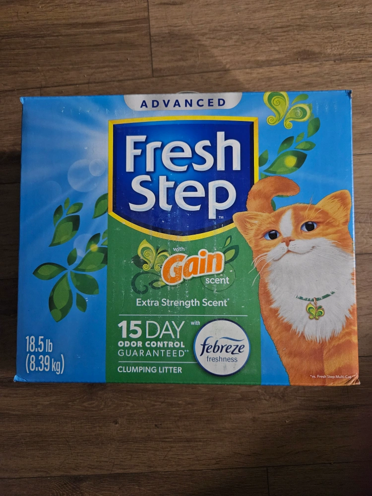 Selling a box of Fresh Step cat litter with Gain scent! This is the advanced formula with extra strength scent and Febreze freshness. The box contains 18.5 lb (8.39 kg) of clumping litter and guarantees 15-day odor control