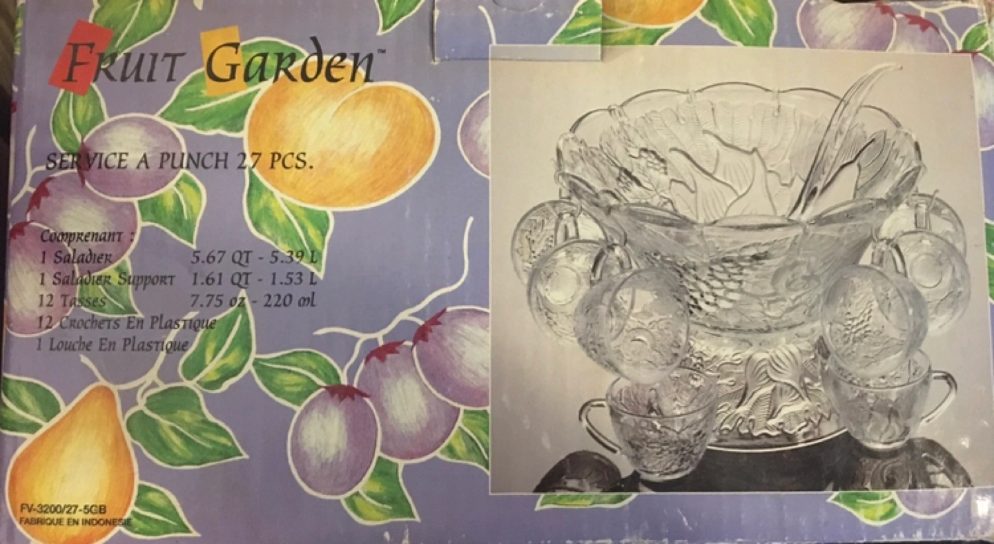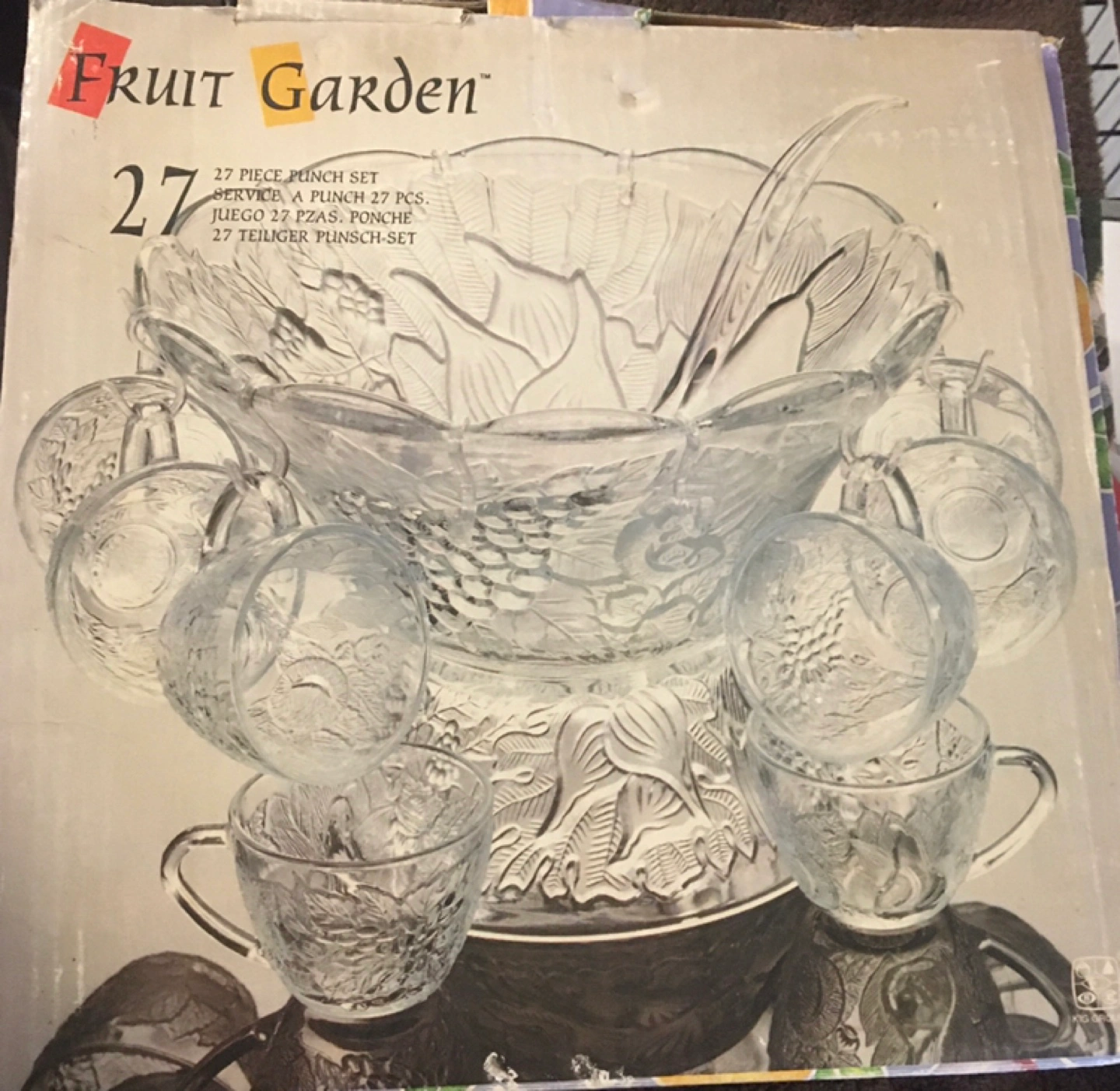 Add a touch of elegance to your gatherings with this Fruit Garden 27-piece punch bowl set, featuring a beautifully embossed design. This set includes a large punch bowl, a ladle, a pedestal base and 12 matching cups, perfect for serving refreshing beverages at parties or special occasions. The set is brand new, still in its original box, never been used. * **Set Includes:** 1 punch bowl, 1 ladle, 1 pedestal base, 12 cups * **Material:** Glass * **Design:** Embossed fruit pattern * **Capacity:** Punch bowl holds approximately 5.67 quarts * **Condition:** New in box While I can't guarantee this punch bowl will make your parties legendary, it will definitely add a splash of vintage charm! Remember, if the ad is up, the punch bowl is available to add some fun to your next gathering! Thanks and please see my other ads!