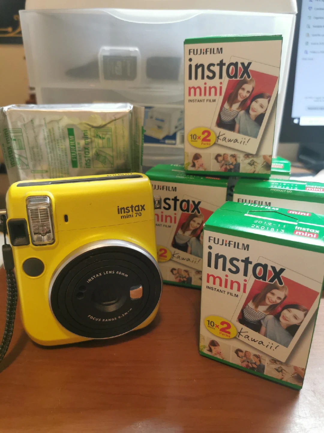 Selling a Fujifilm Instax Mini 70 camera in yellow! It comes with some Instax Mini instant film. Perfect for capturing fun memories! with 5 X (10 X 2 Film Packs) exp 2019 8 X (10 Film Packs) No Battery. u can bring battery and check first. CR2 Battery 2 Total 180 films