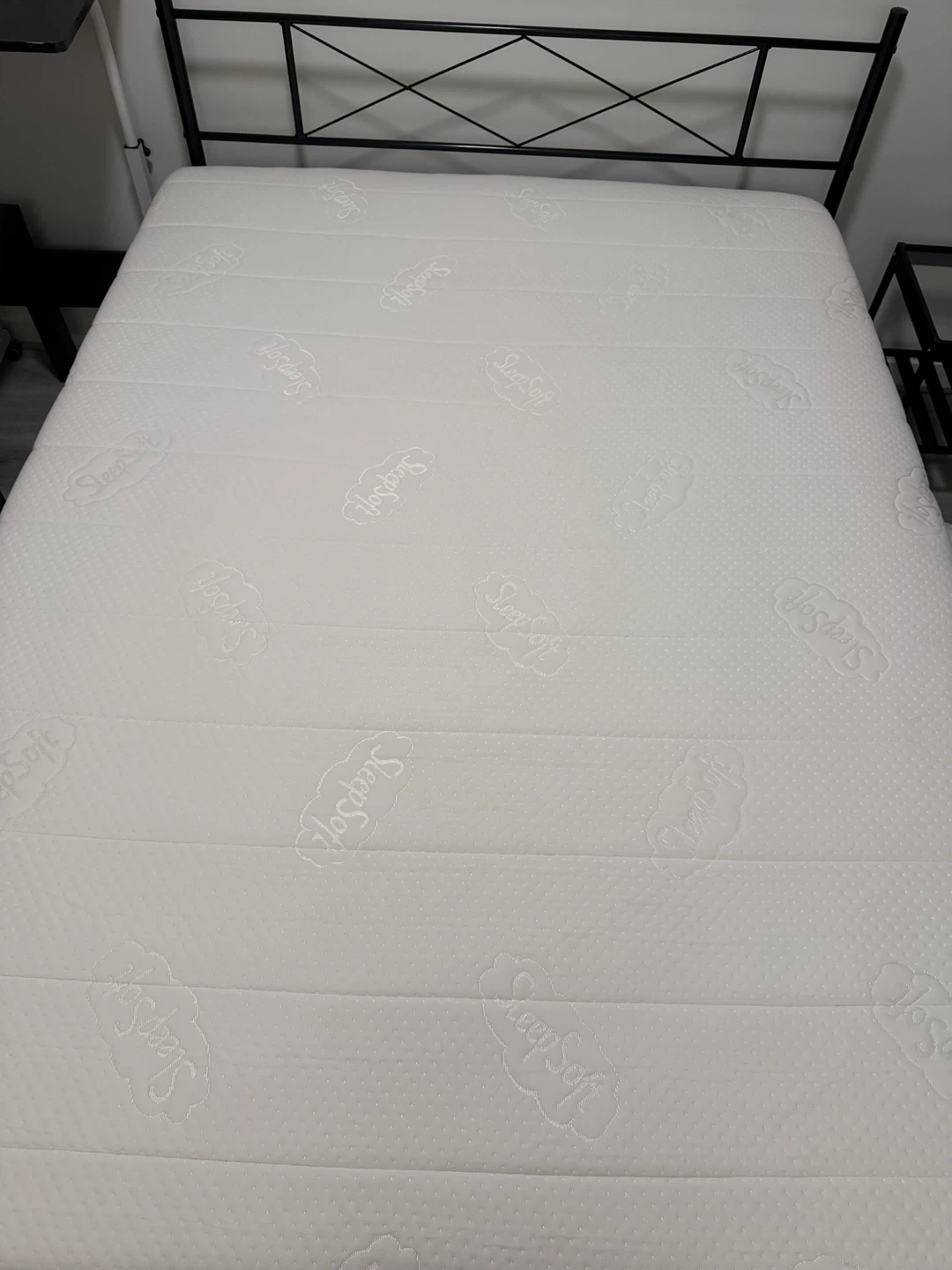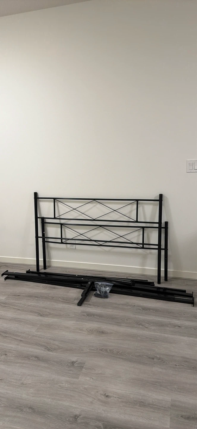 Sleek black metal frame with a clean, modern look. Comes with a comfy mattress, both in excellent condition. Perfect fit for a minimalist or contemporary bedroom setup. Plus 3 pillows