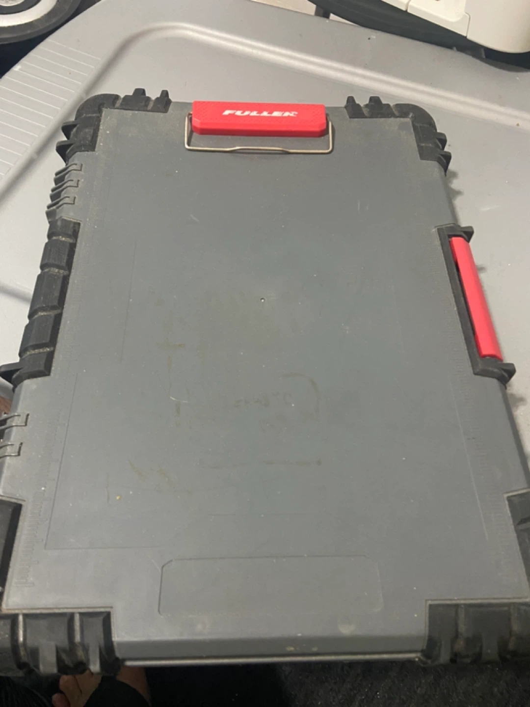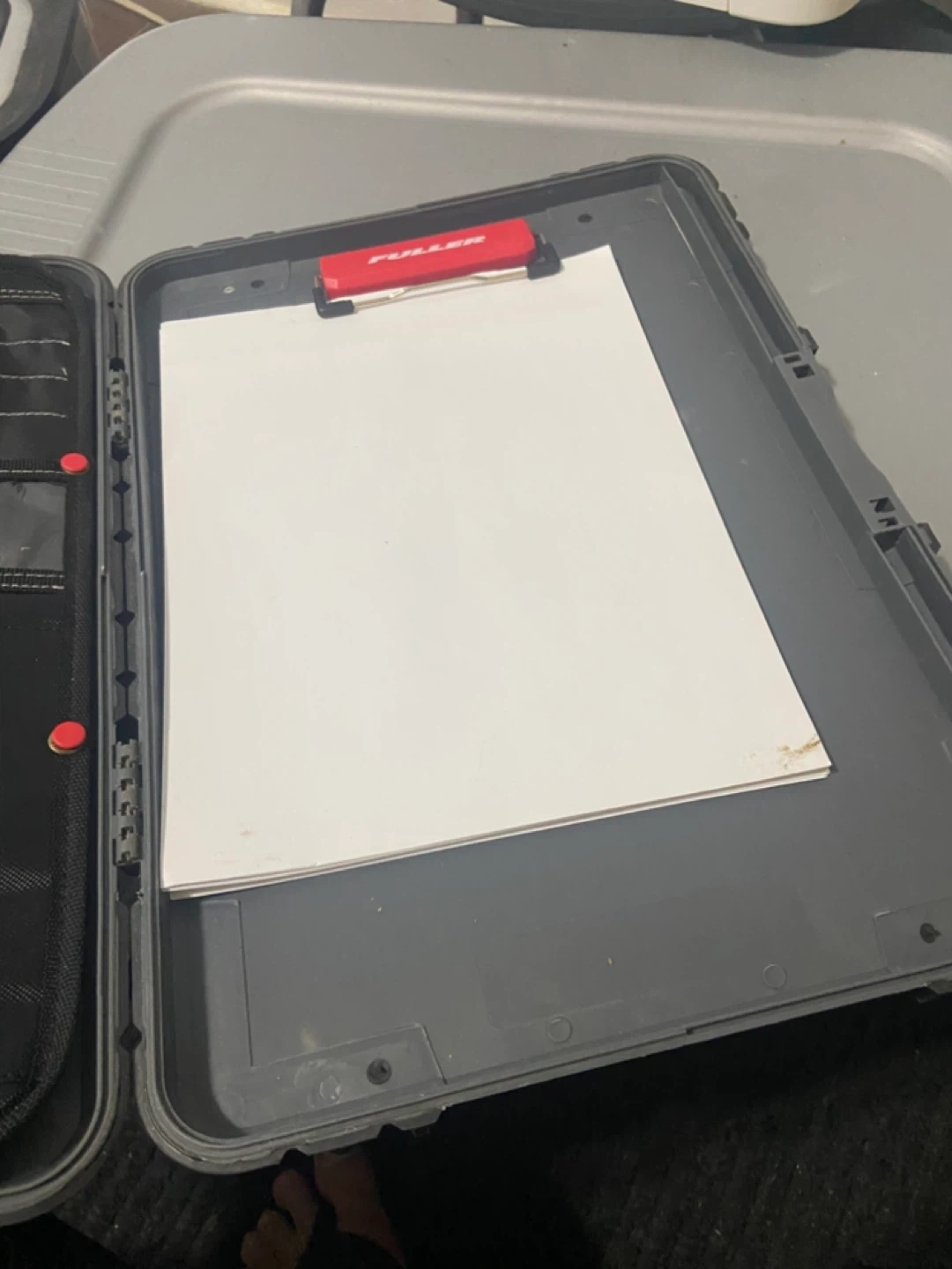 Selling a portable contractor clipboard by Fuller. It has a grey exterior with black accents and a red clip. It also has interior pockets for organization and a clipboard inside Perfect for on-the-go note taking! With clip lock