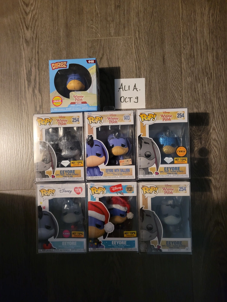 Selling a collection of Funko Pop! figures featuring Eeyore from Disney's Winnie the Pooh! Includes: - Dorbz 448 Chase Eeyore - Pop! 254 Eeyore (Hot Topic Exclusive) - Pop! 1413 Eeyore with Balloon (BoxLunch Exclusive) - Pop! 254 Diamond Glitter Eeyore (Hot Topic Exclusive) - Pop! 1170 Flocked Eeyore (Hot Topic Exclusive) - Pop! 1131 Eeyore with Santa Hat (Hot Topic Exclusive) - Pop! 254 Eeyore All figures are in their original boxes Local meet up Scarborough Delivery available around GTA Prepaid shipping available within Canada ***Highly rated in the Marketplace ***Lots of references available ***Deals on multiple ***Bundle deals available ***Flexible No-rush Payment plans available ***Free shipping available 1000 awesome funko pops available DC, MARVEL, DISNEY, ANIME many more Something for everyone Happy funko hunting