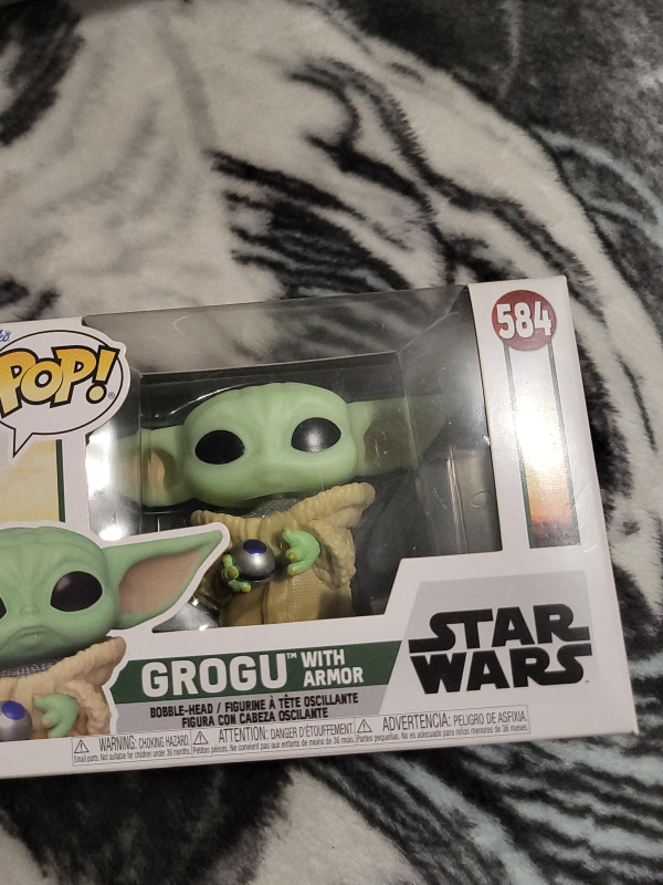 Selling a Funko Pop! figure of Grogu with Armor from Star Wars. It's number 584 in the series. This bobble-head figurine is still in its original packaging!