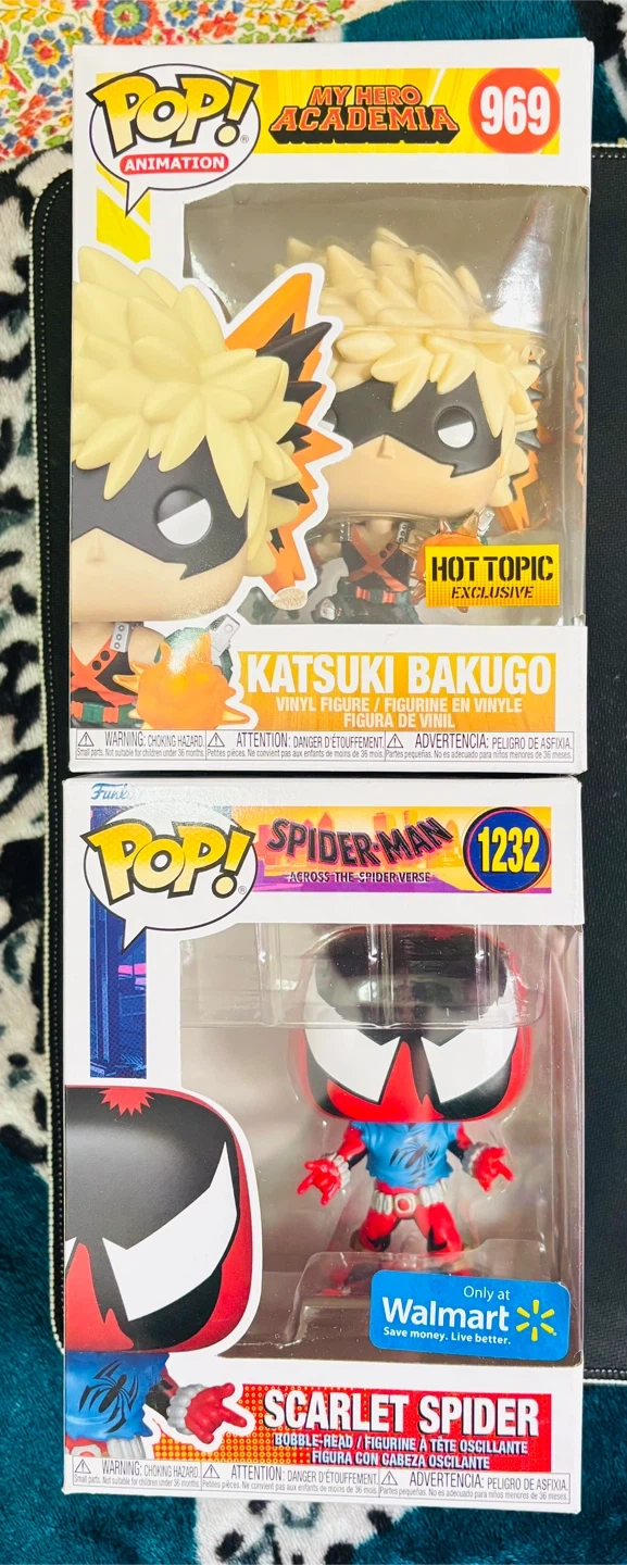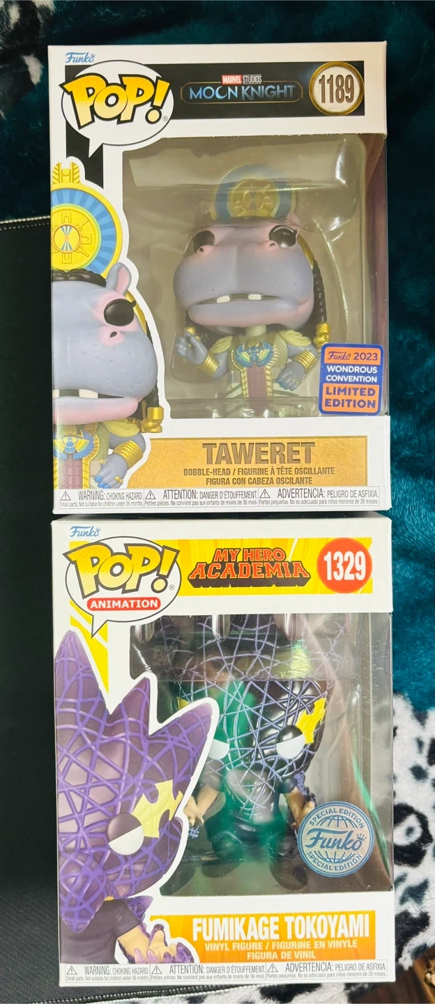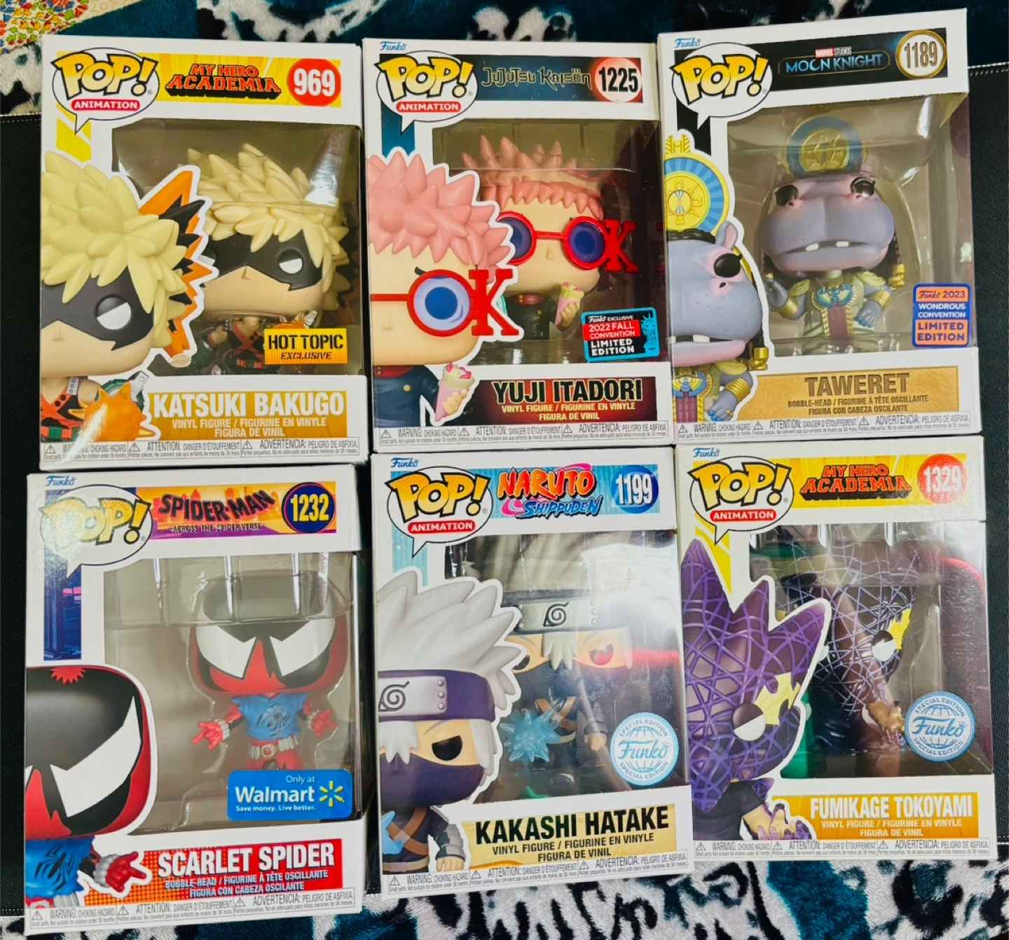 Selling a collection of Funko Pop! vinyl figures, including: - My Hero Academia Katsuki Bakugo (969) - Hot Topic Exclusive - Jujutsu Kaisen Yuji Itadori (1225) - 2022 Fall Convention Limited Edition - Moon Knight Taweret (1189) - 2023 Wondrous Convention Limited Edition - Spider-Man Scarlet Spider (1232) - Walmart Exclusive - Naruto Shippuden Kakashi Hatake (1199) - Special Edition - My Hero Academia Fumikage Tokoyami (1329) - Funko Special Edition $30 each