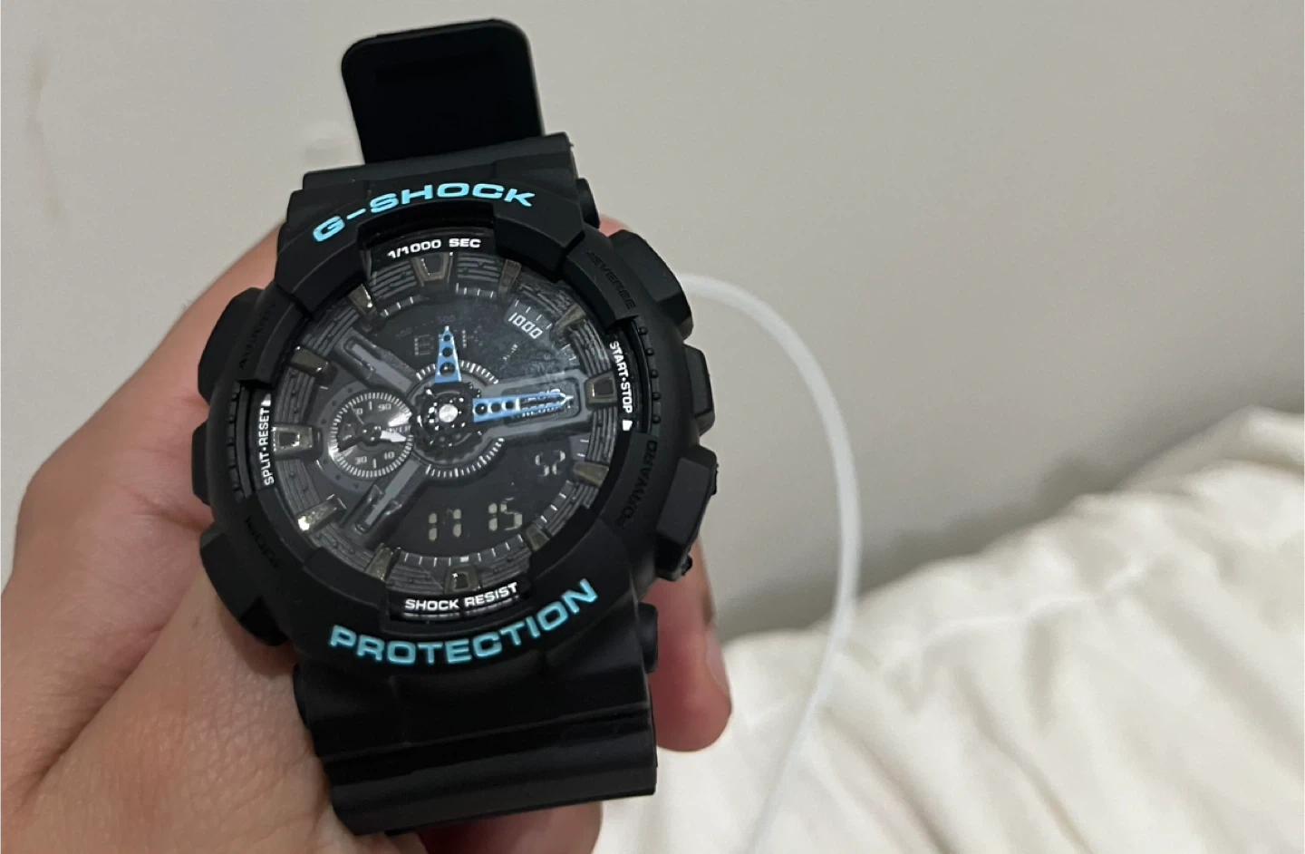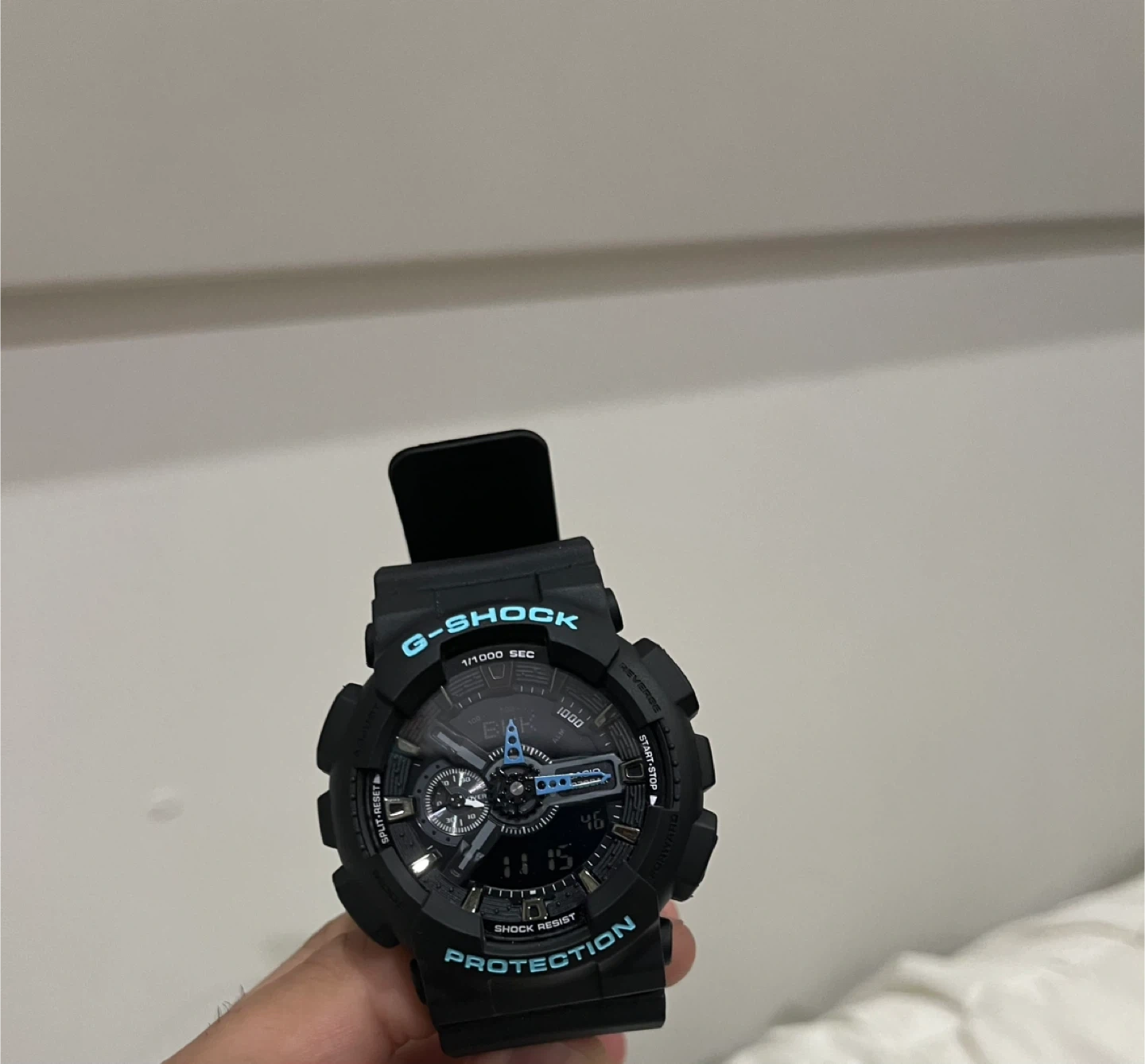Selling a G-Shock watch in black with blue accents! It's in great shape and not a single scratch on that. The same model is no longer in production in this colour. Have switched to a comfortable black strap. Got it as a gift but not my style.