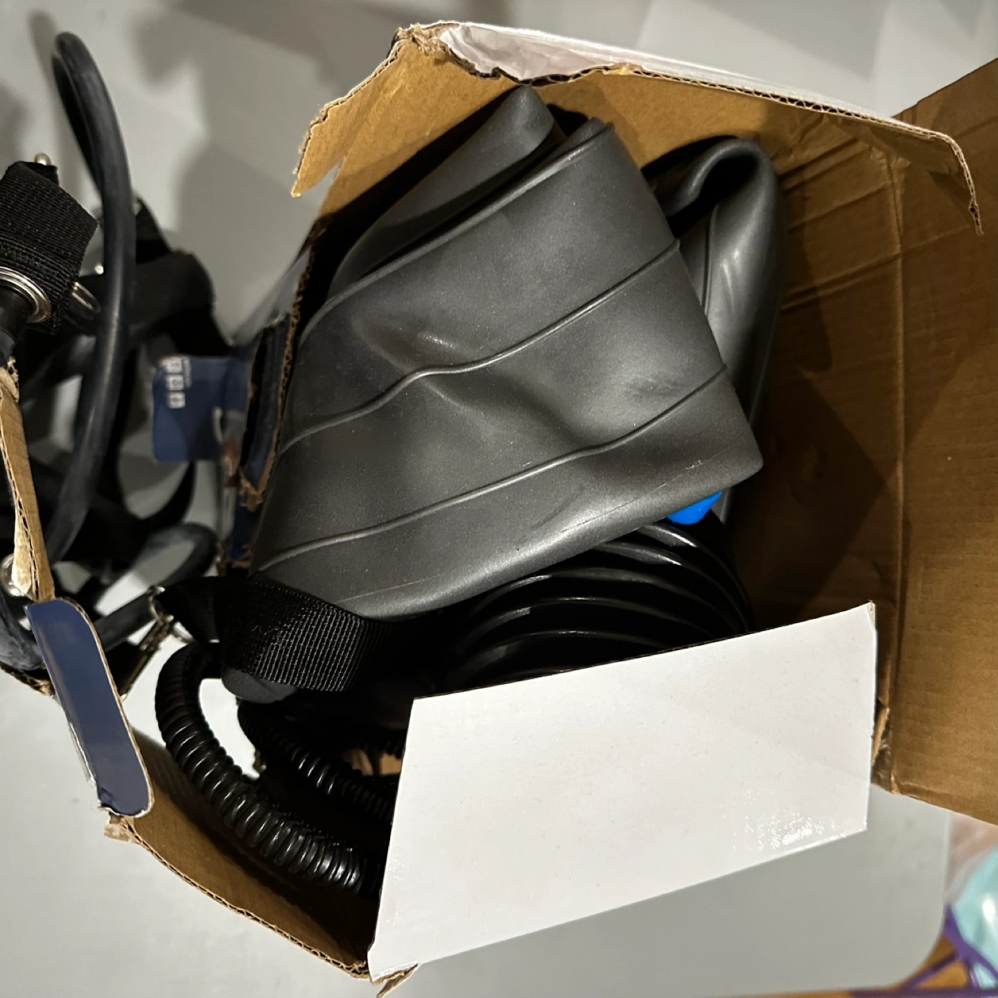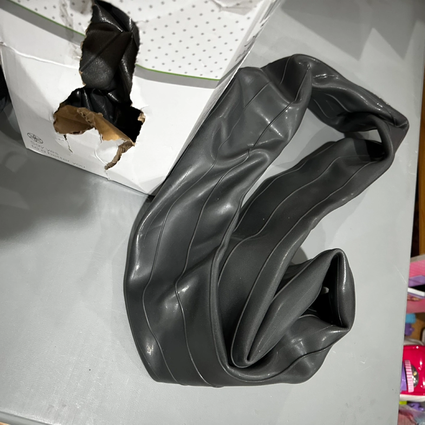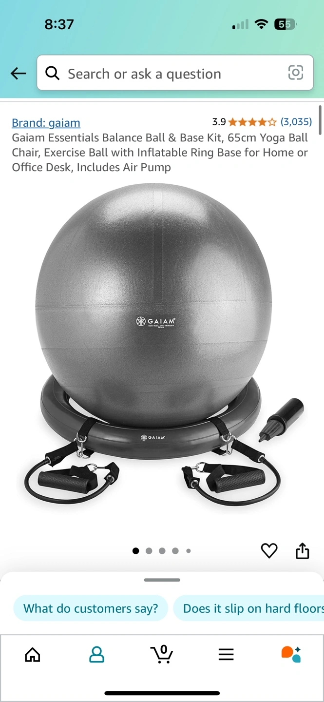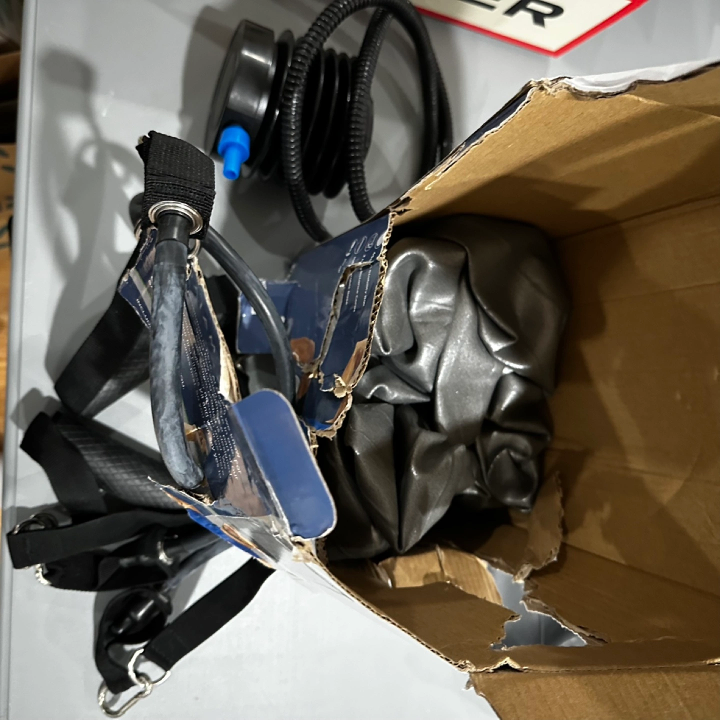 Slightly damaged box. Includes inflatable balance ball, ring base, resistance bands, and air pump. Great for home or office.