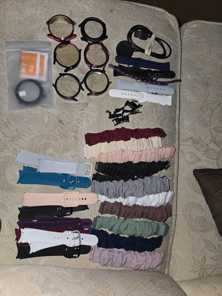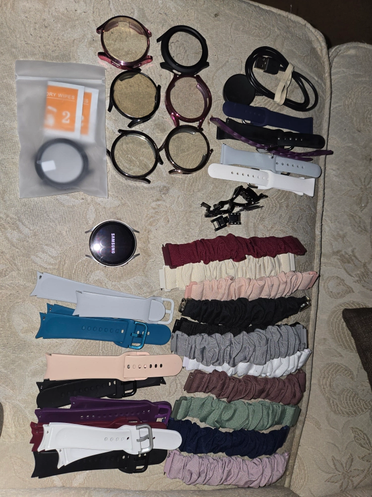 Galaxy watch 4 — 44mm screen, 20mm bands. Included in Bundle — Watch, Charger, 7 face covers, 6 slim style bands, 11 scrunchie bands, 8 medium/large silicone bands. MUST TAKE ALL, WILL NOT SEPARATE! 160$ — NEED GONE ASAP WILLING TO MAKE A DEAL ON MULTIPLE ITEMS!