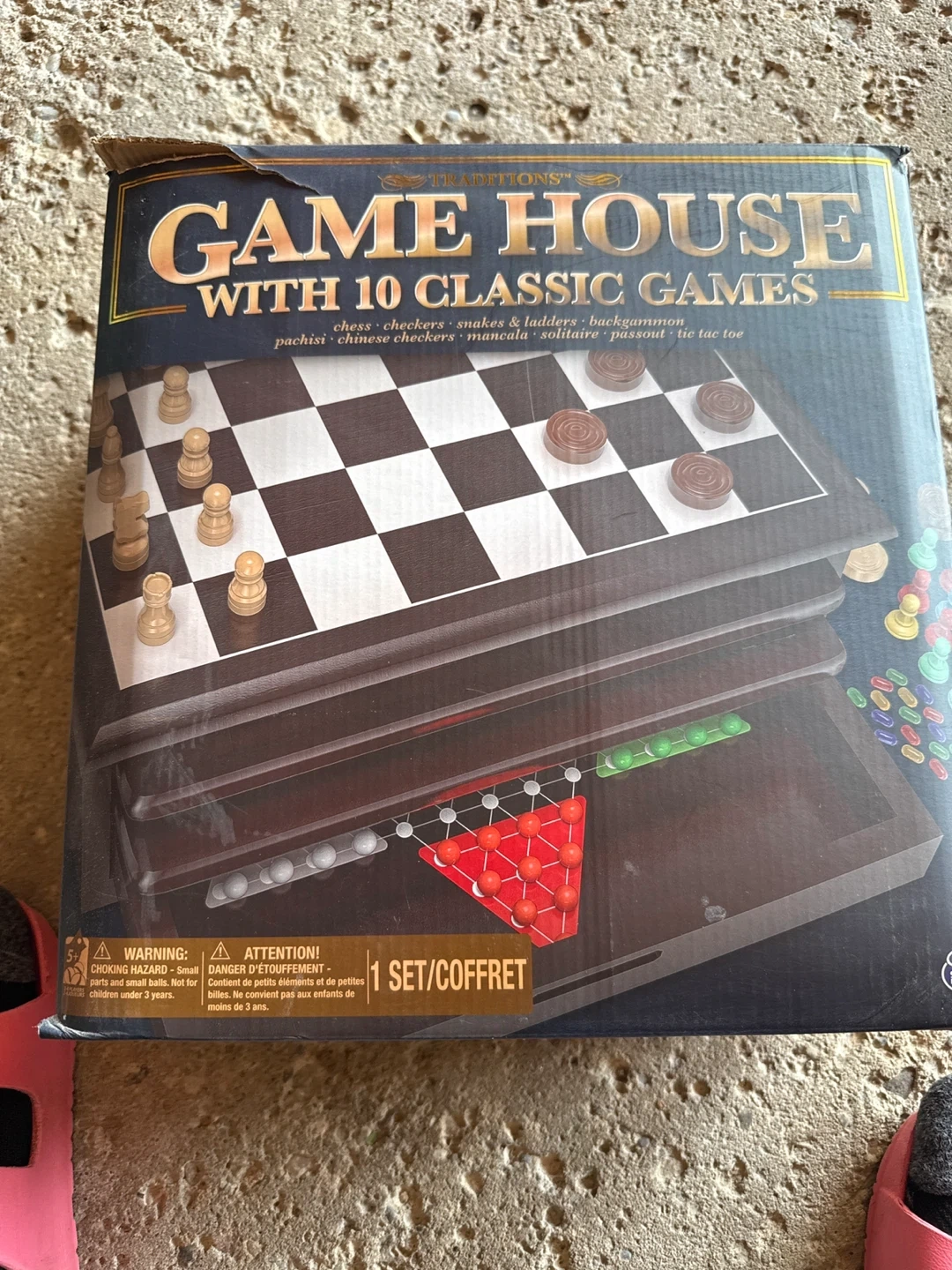 Selling a Game House with 10 classic games! It includes chess, checkers, snakes & ladders, backgammon, pachisi, chinese checkers, mancala, solitaire, passout, and tic tac toe. It is recommended for children 3 years and older