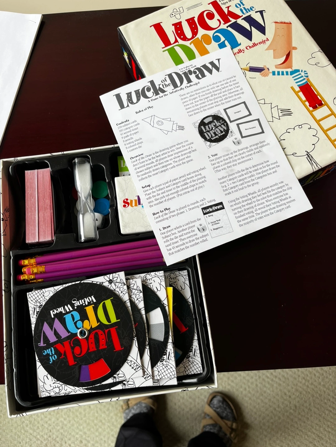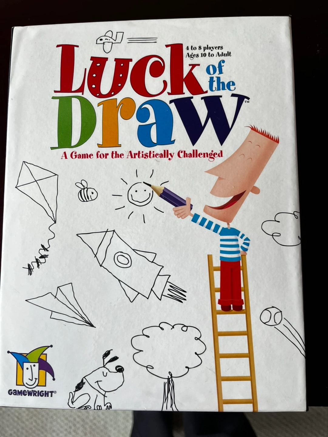 Fun party game for 4-8 players. Ages 16+. Includes game board, cards, pencils, and timer. A game for the artistically challenged. All pieces present. From pet/smoke free home.