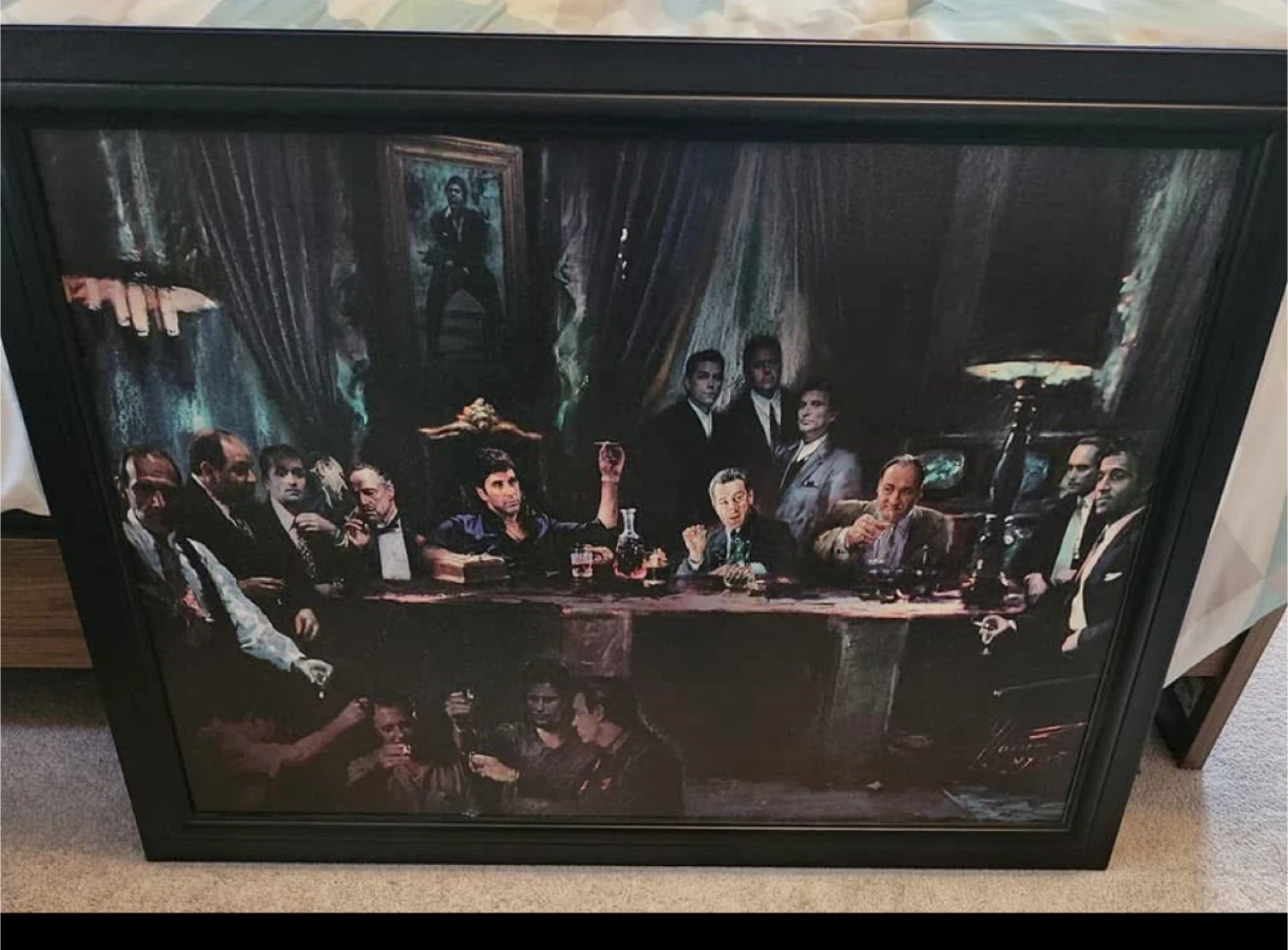 Selling framed Gangster Last Supper. It's in great condition with the exception of a few scratches on the print. It’s ready to hang in your home or office!