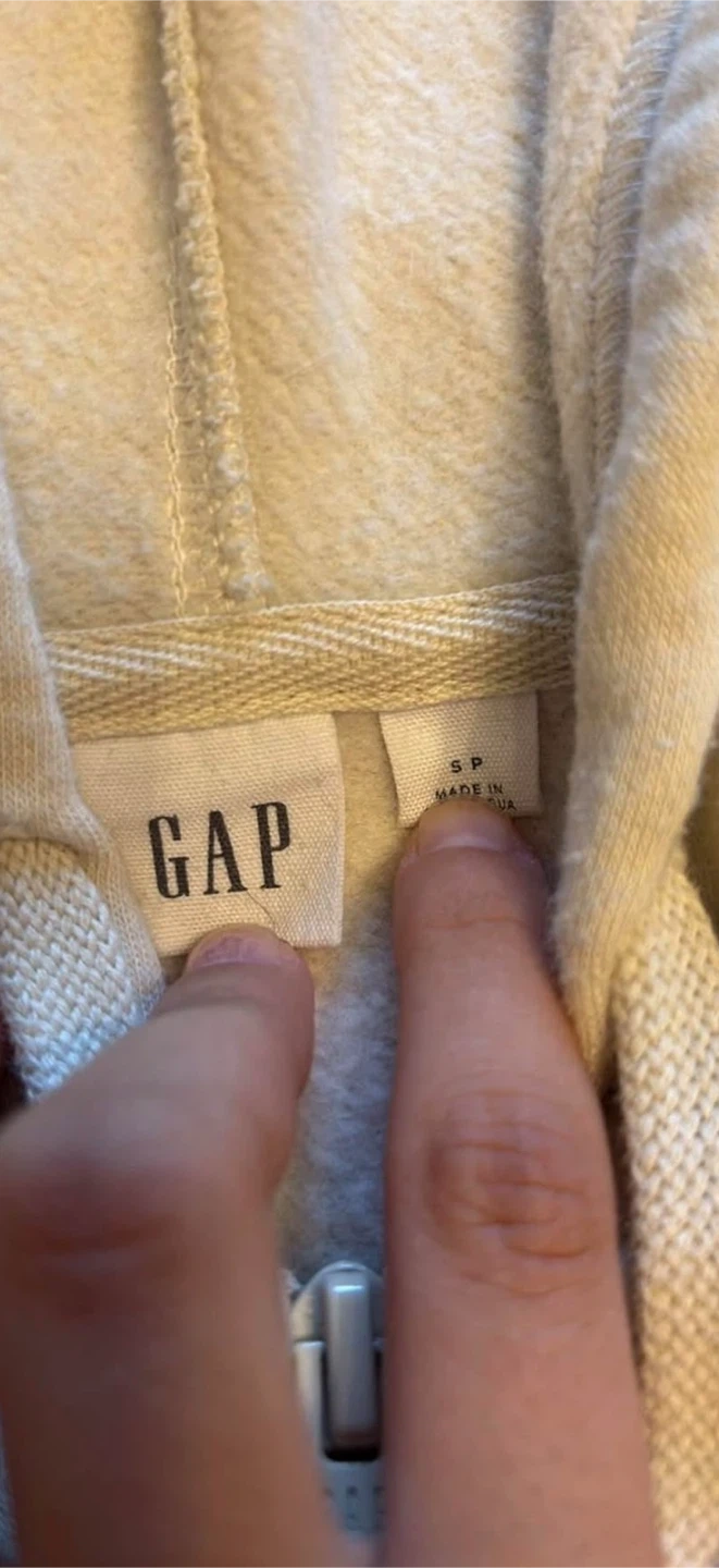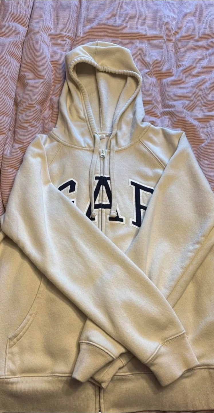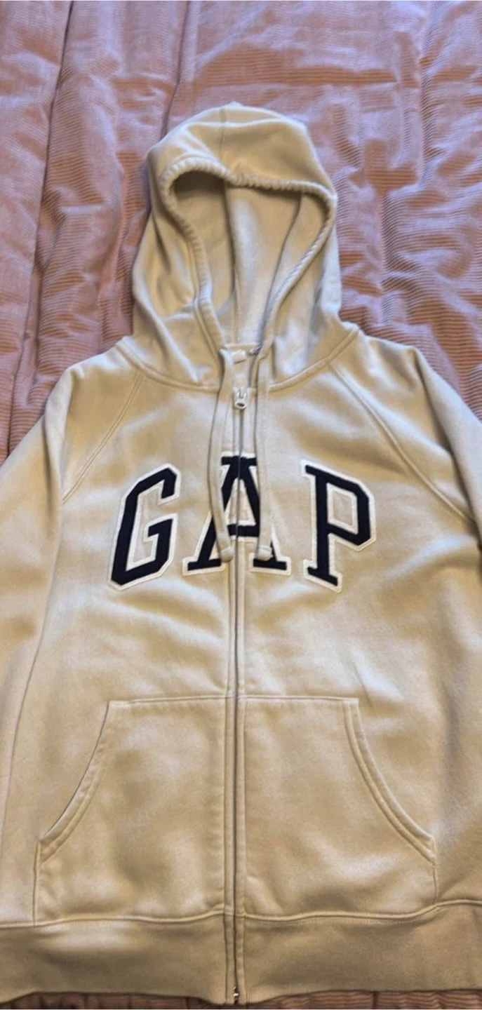 Selling a gently used GAP full zip hoodie in a lovely beige colour. It's a size small. The hoodie is in great condition and perfect for layering or wearing on its own. A classic and comfortable piece!