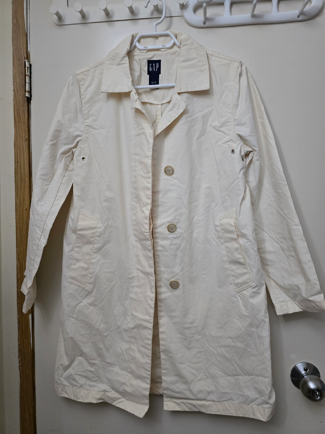 Selling a cute cream-coloured trench coat from GAP! It's a size XS/TP. Great for layering and perfect for spring or fall weather