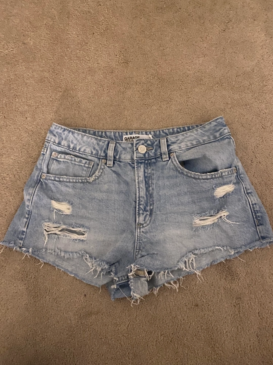 Cute denim shorts from Garage! They're in good condition and feature a trendy distressed look. Perfect for summer!