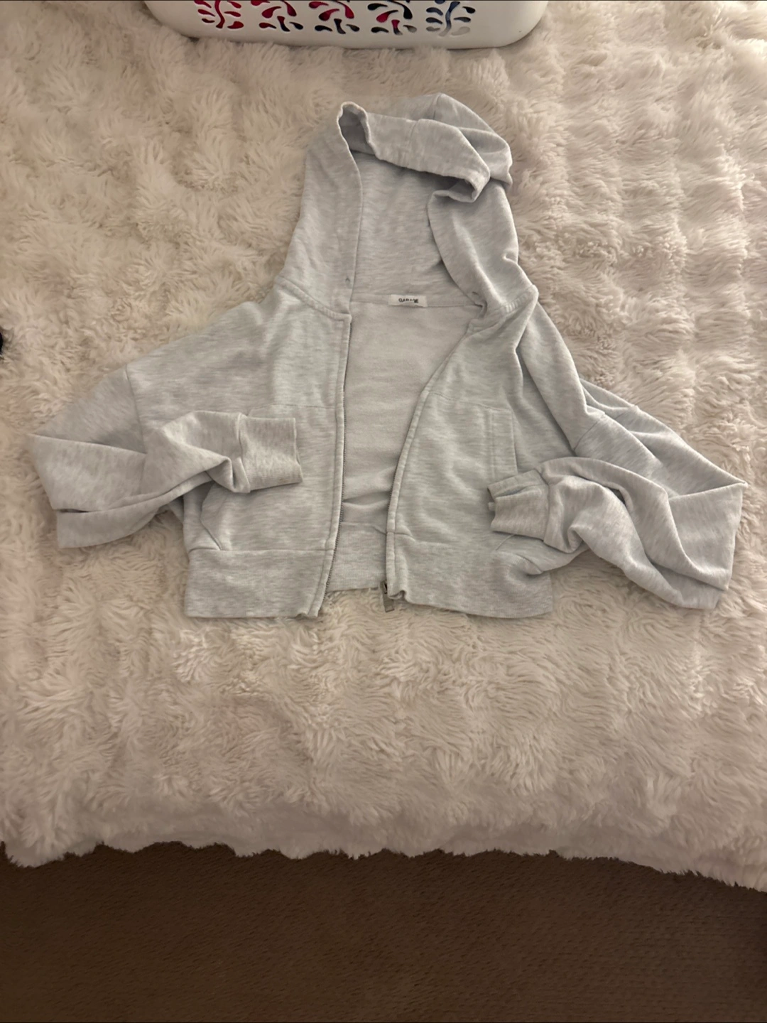 Selling a light grey cropped zip-up hoodie from Garage! It's in great condition and perfect for layering or wearing on its own