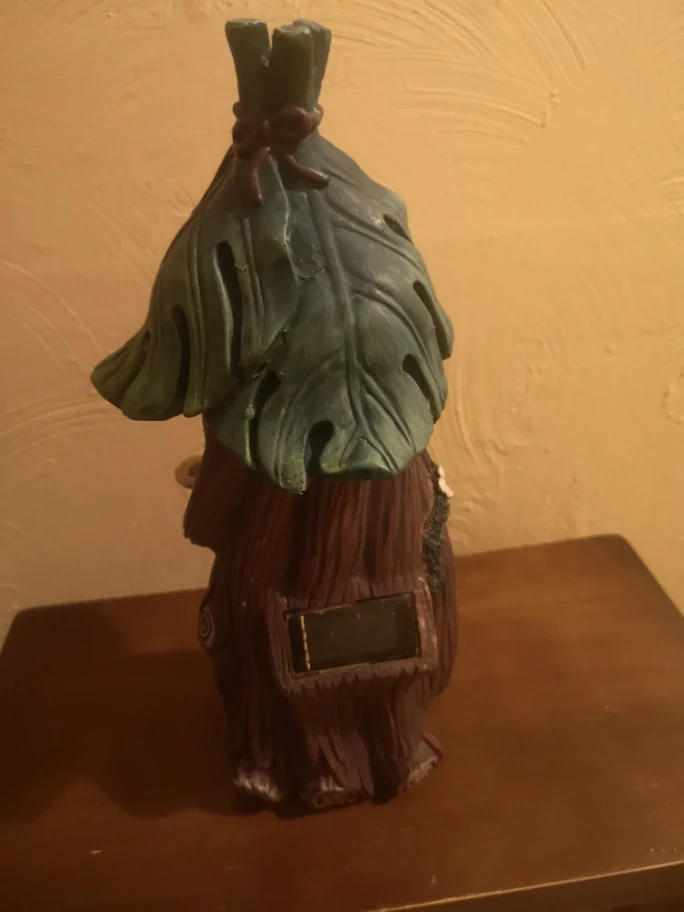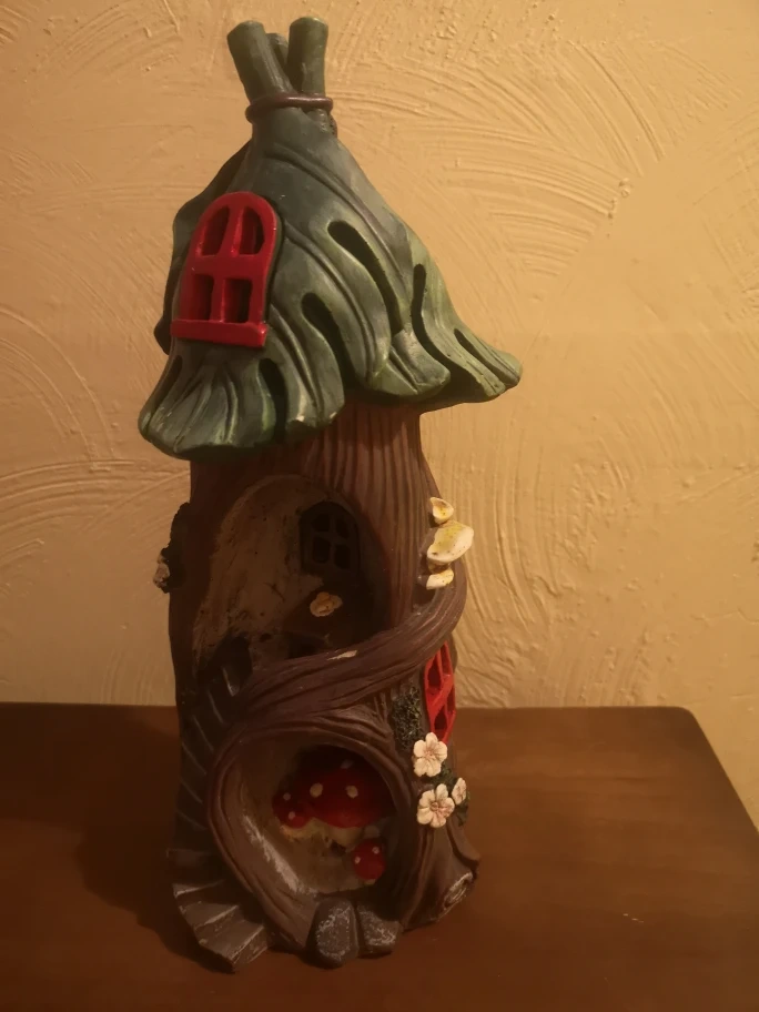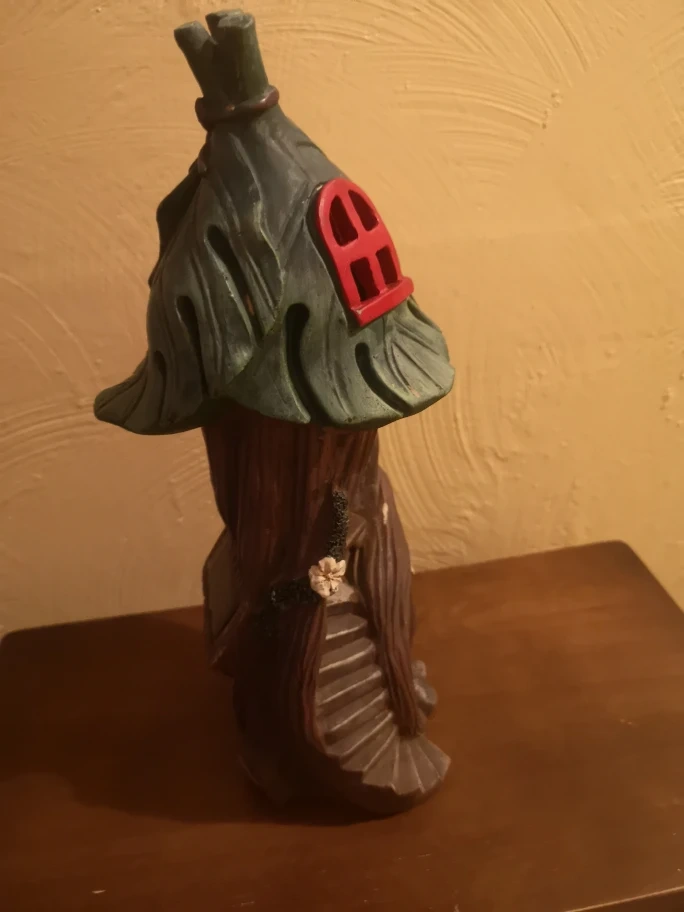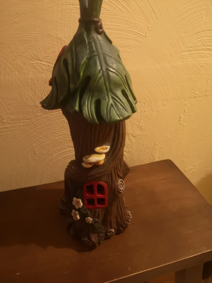 A charming fairy house statue for your garden or indoor space! This whimsical piece features a tree-trunk design with a leaf-shaped roof and cute red windows. It's perfect for adding a touch of magic to any setting